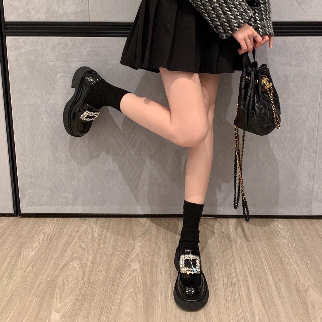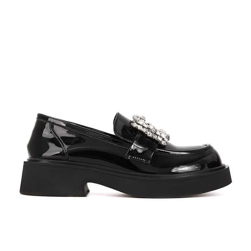 水钻方扣厚底乐福鞋女2025春季新款圆头英伦风粗跟小皮鞋单鞋