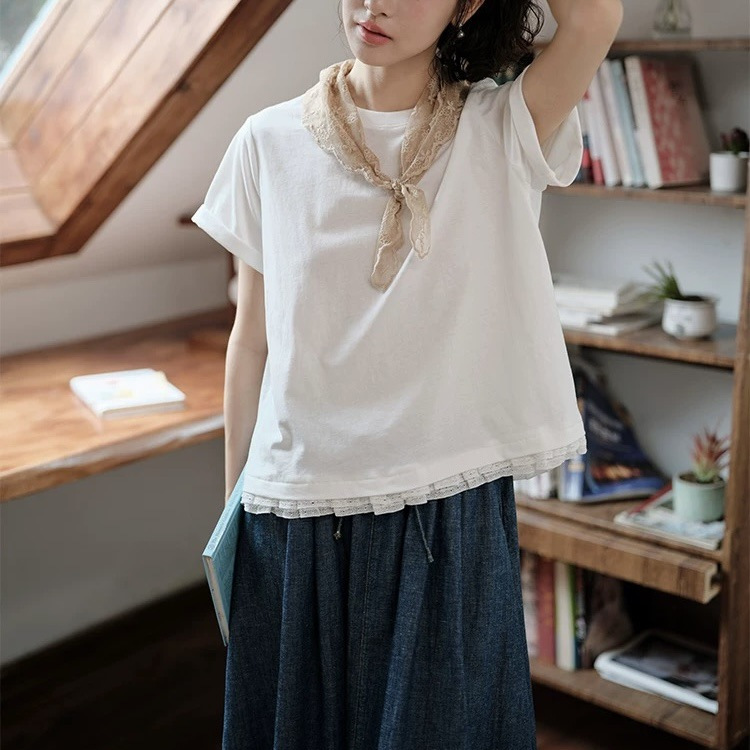 米白花边短袖上衣休闲文艺感日系风格穿搭女夏