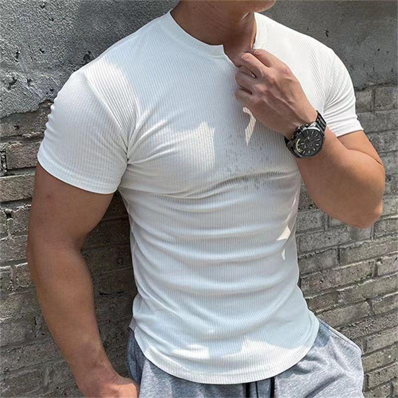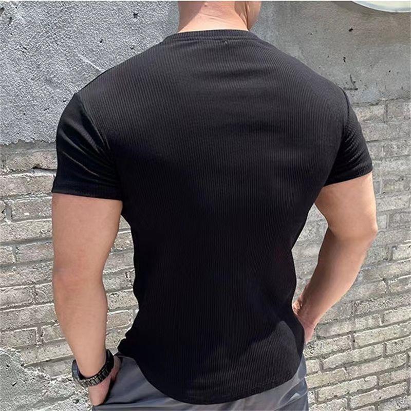 螺纹运动领短袖男质感纯色条纹修身弹力速干跑步健身服恤打底衫