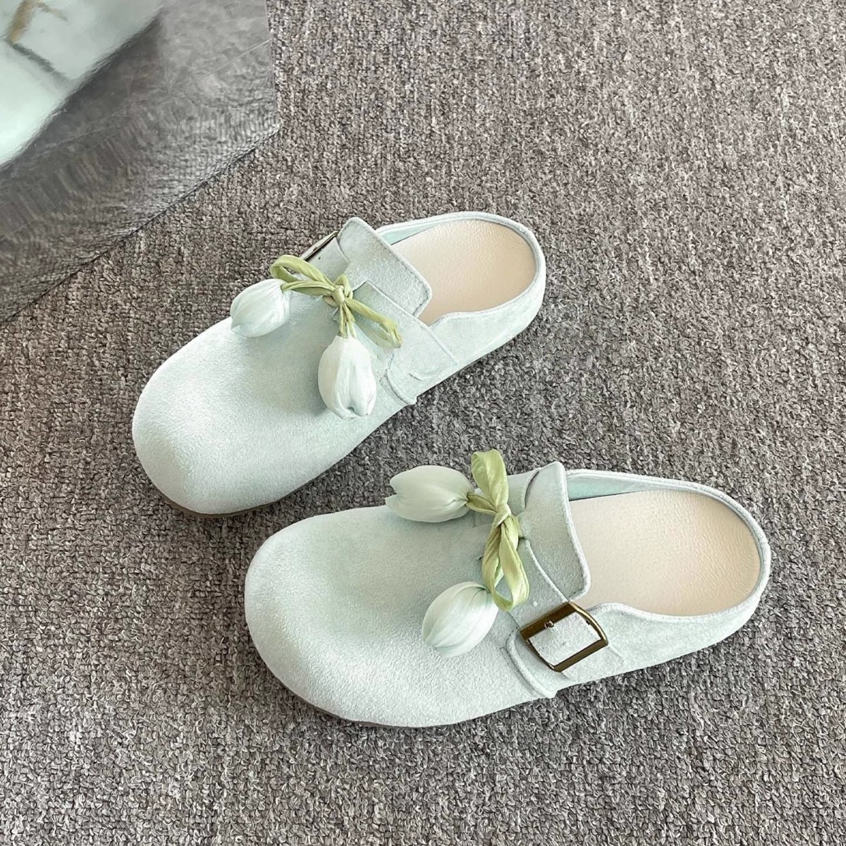 复古花朵配裙子包头半拖鞋女外穿2025夏季新款百搭一脚蹬勃肯鞋