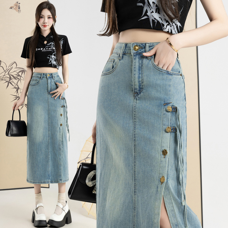 新中式国风复古高腰牛仔裙女新款开叉设计感小个子盘扣a字裙