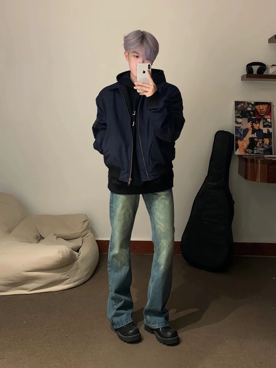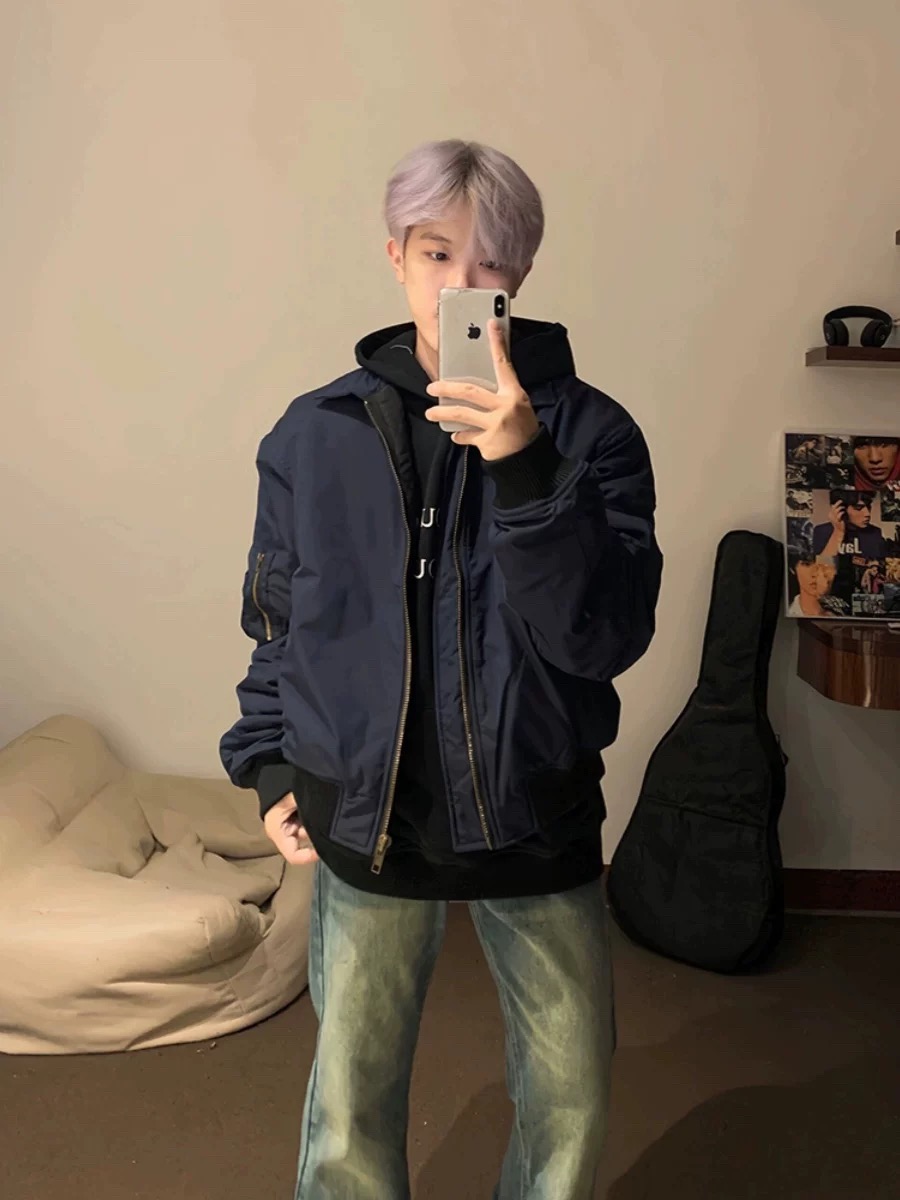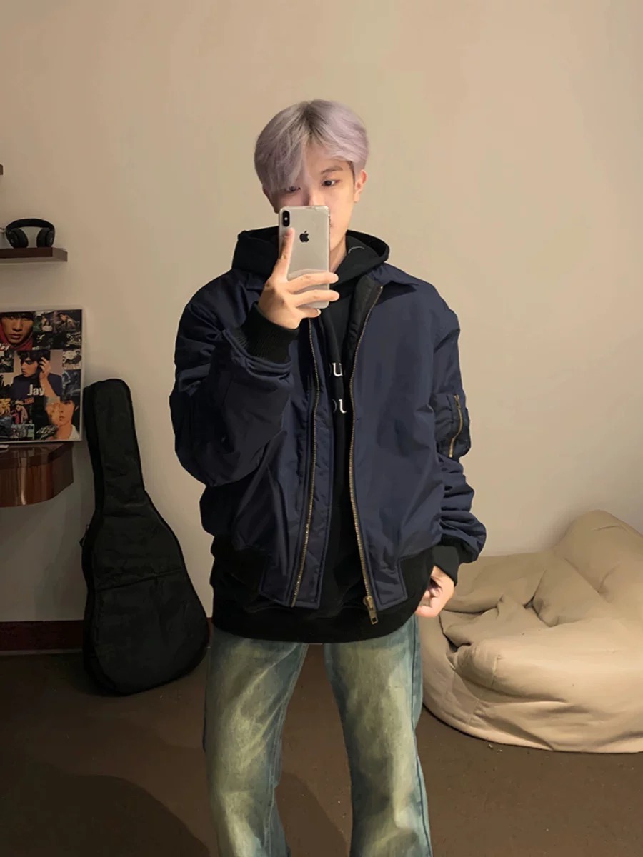 美式复古藏青色飞行员夹克外套潮牌欧美街头短款棒球服男