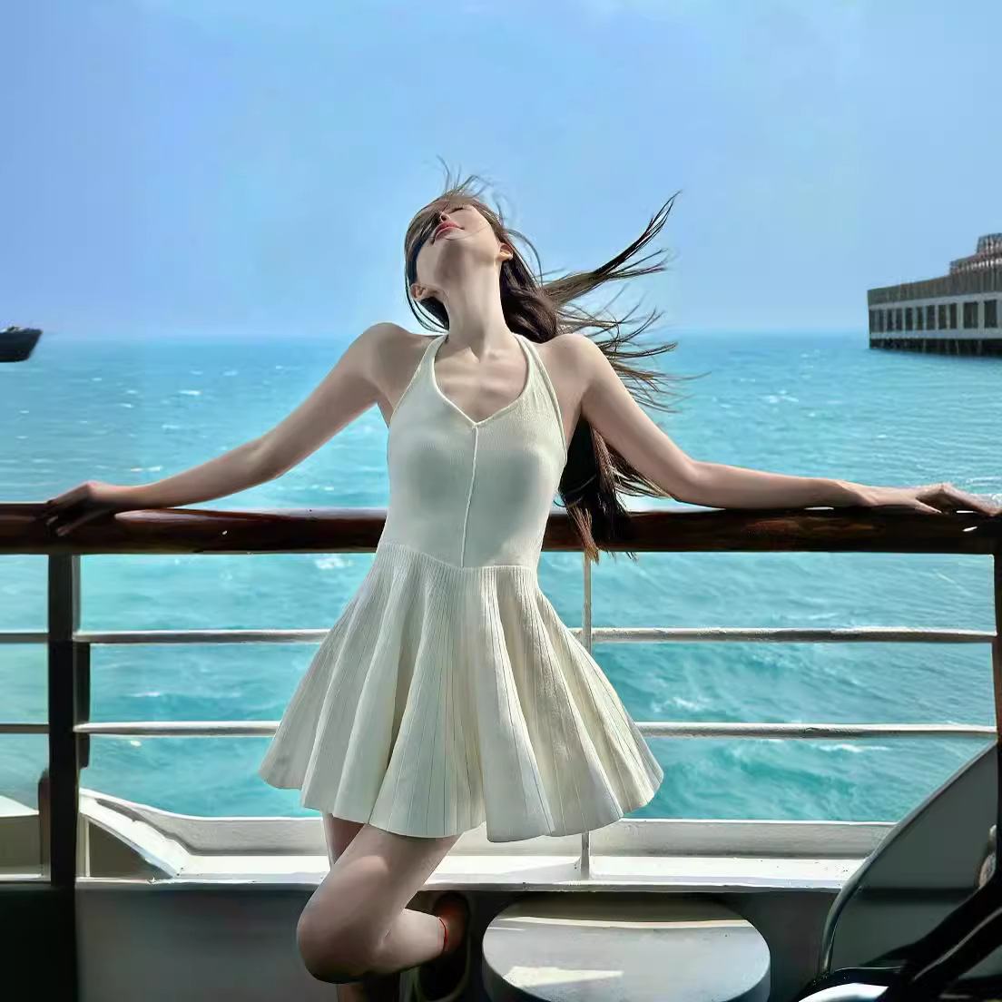 法式浪漫温柔气质露背挂脖针织连衣裙女修身收腰A字百褶蓬蓬短裙