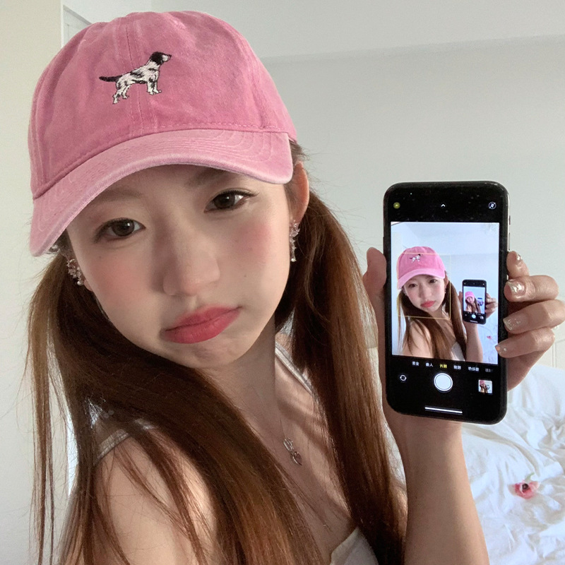 夏季显脸小韩版可爱小狗刺绣水洗粉色棒球帽女软顶休闲百搭鸭舌帽
