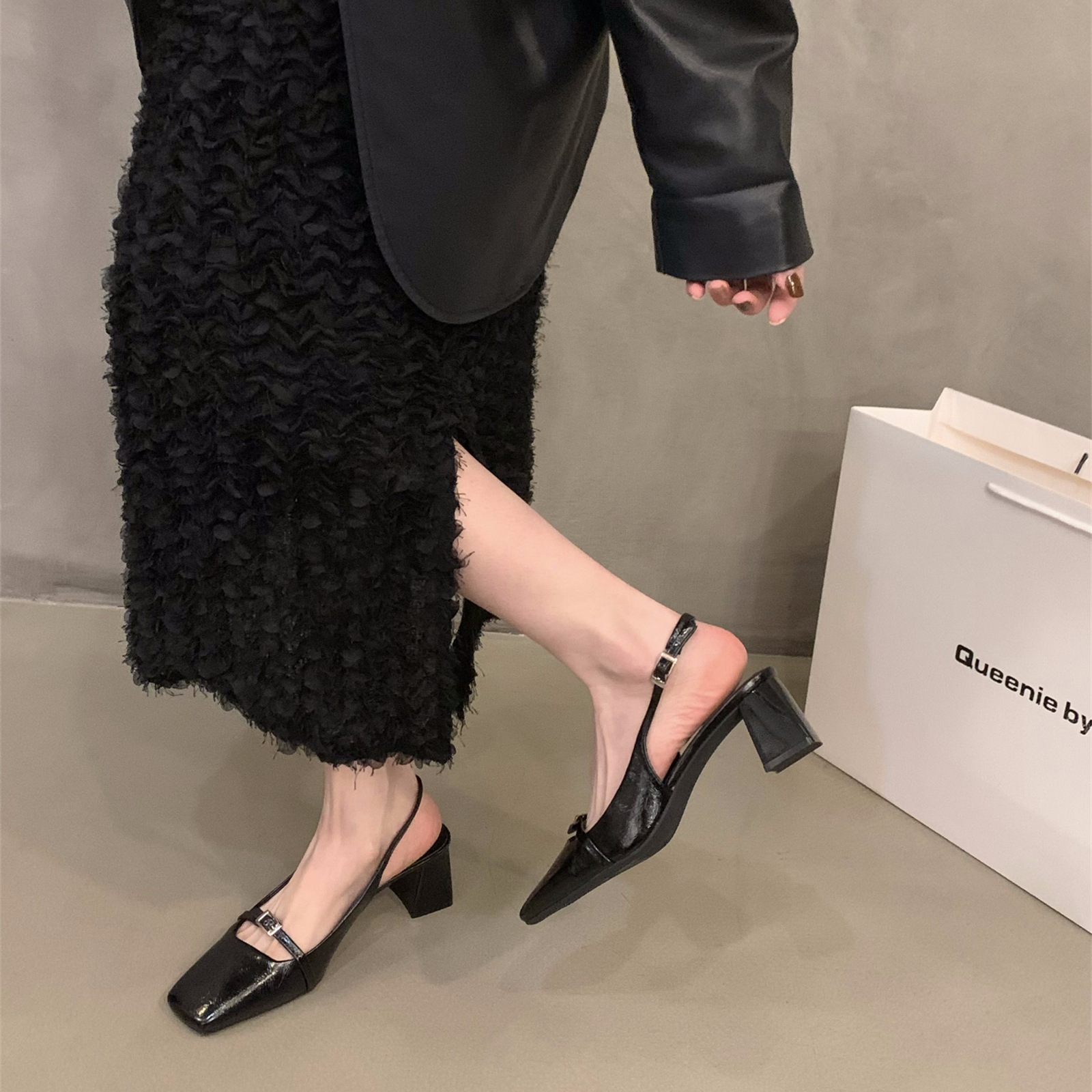 法式粗跟高跟鞋黑色包头凉鞋仙女鞋子新款春夏季方头后空单鞋