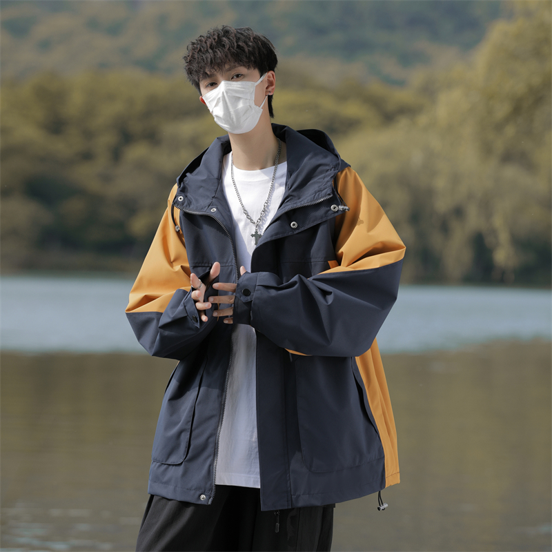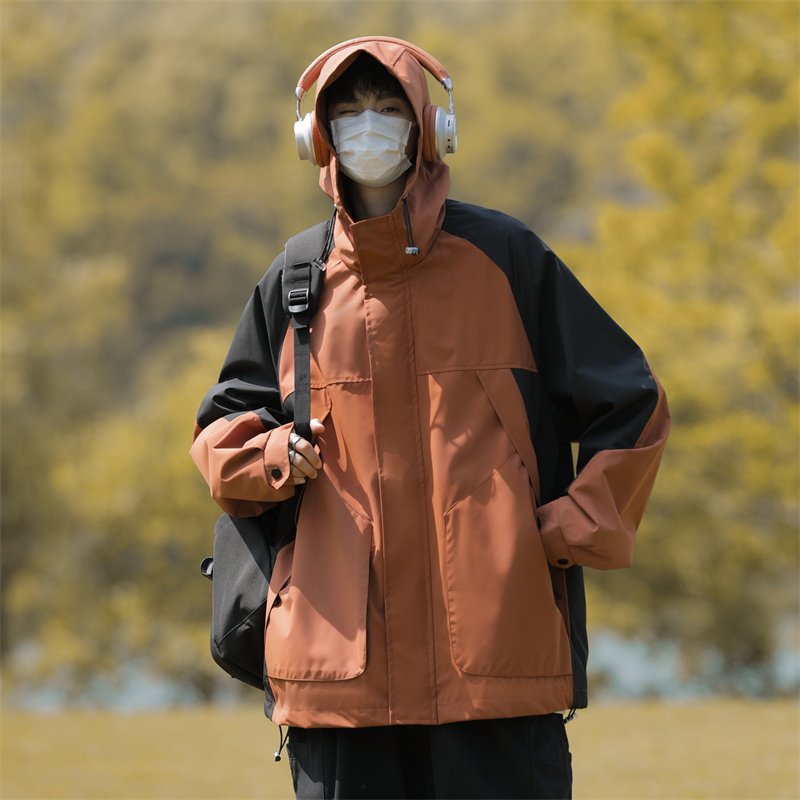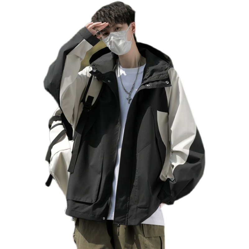 工装夹克男秋季潮牌户外机能痞帅宽松拼接撞色连帽冲锋衣
