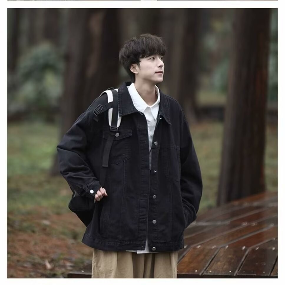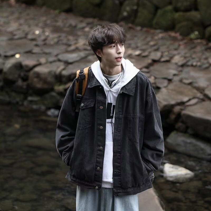 帅气黑色牛仔外套男士夹克春秋款美式小众复古潮牌男款高级感工装