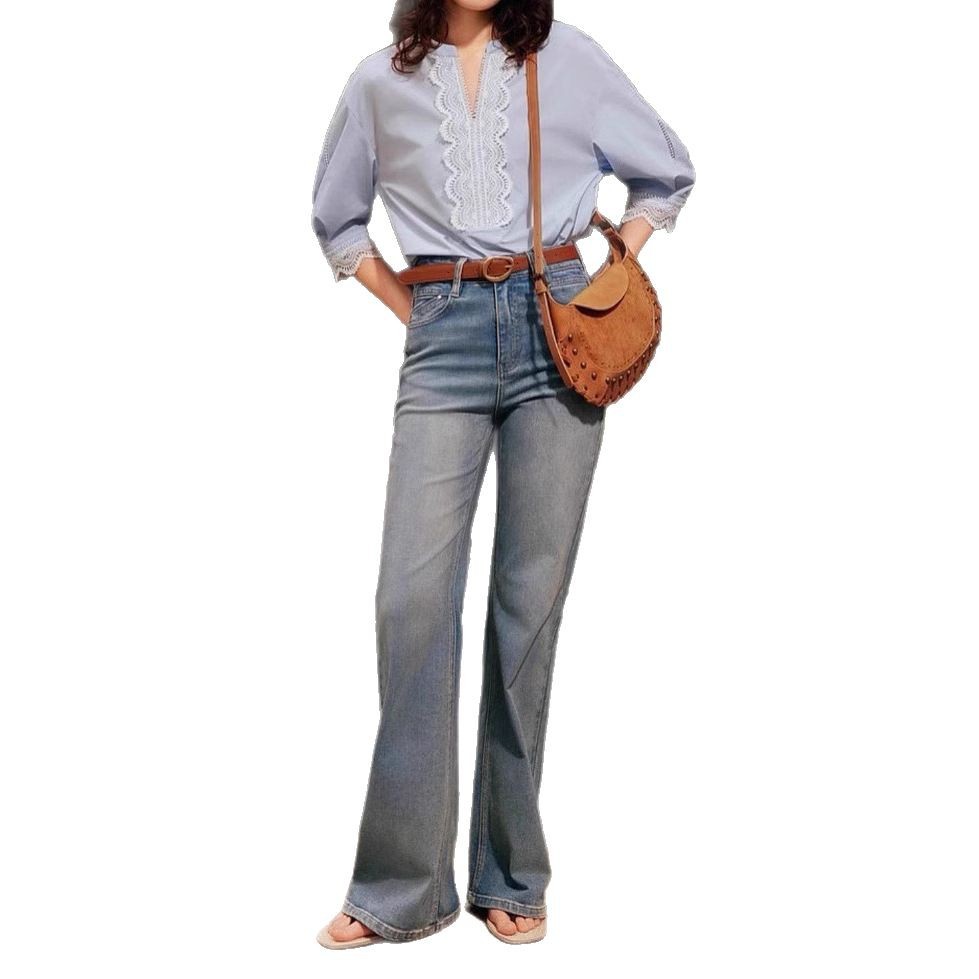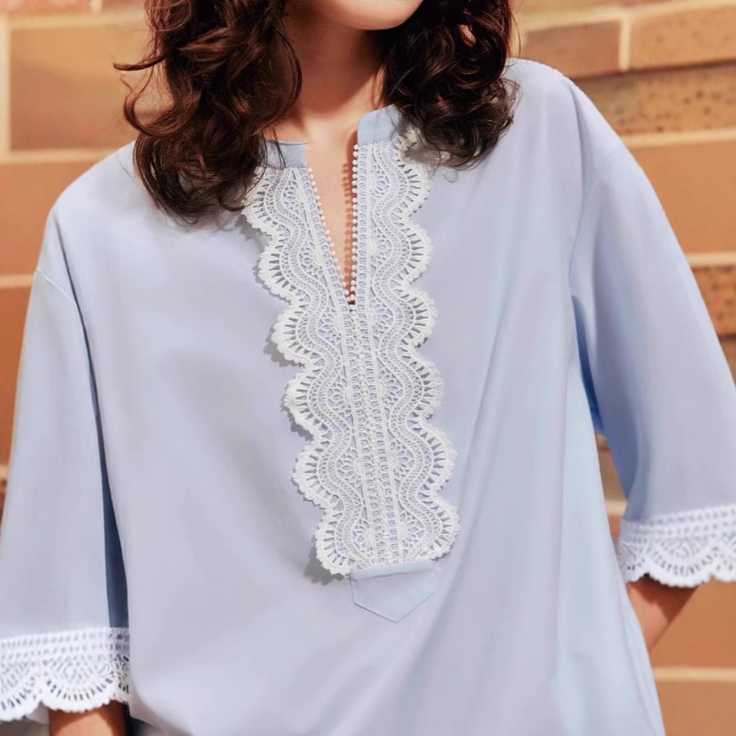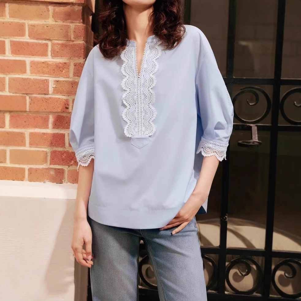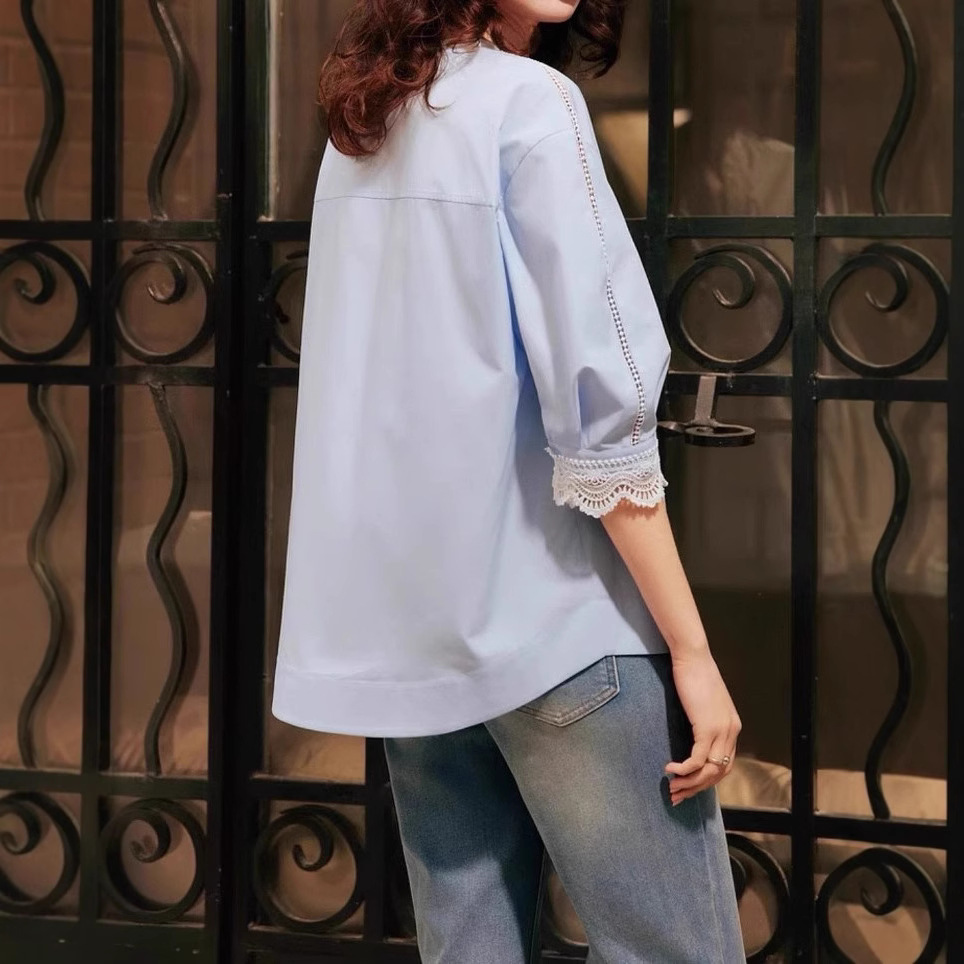 ELEL法式设计感撞色花边衬衣2025女夏新款气质通勤小众宽松衬衫