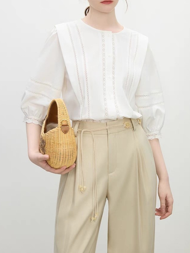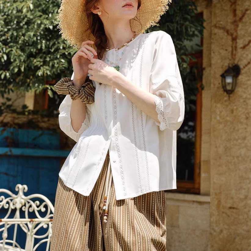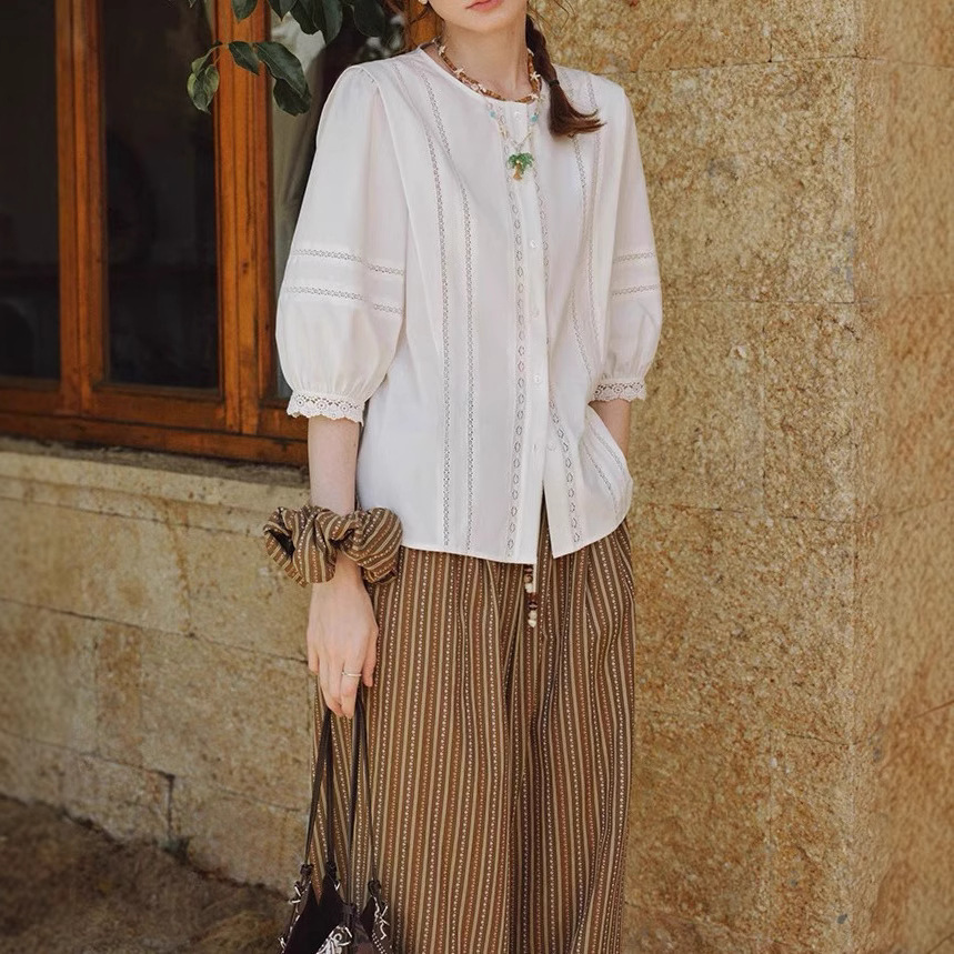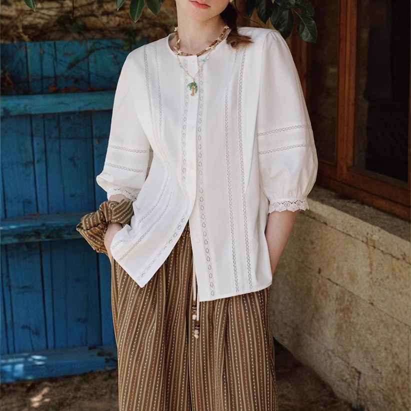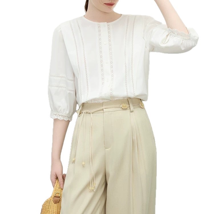 镂空花边气质灯笼中袖衬衫女2025夏新款百搭衬衣