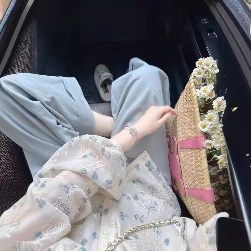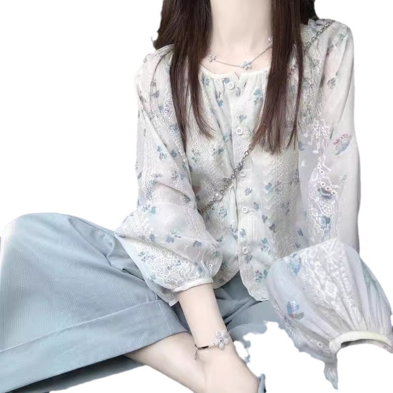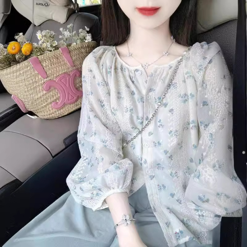 A French gentle lace floral long-sleeved shirt with a feminine design sense, a niche sweet and hot girl's new summer versatile top