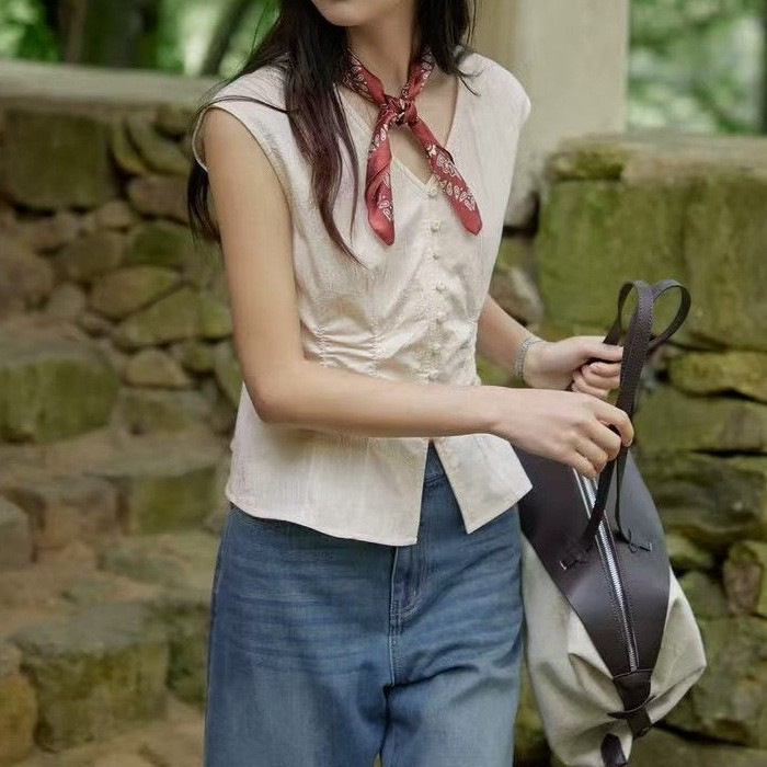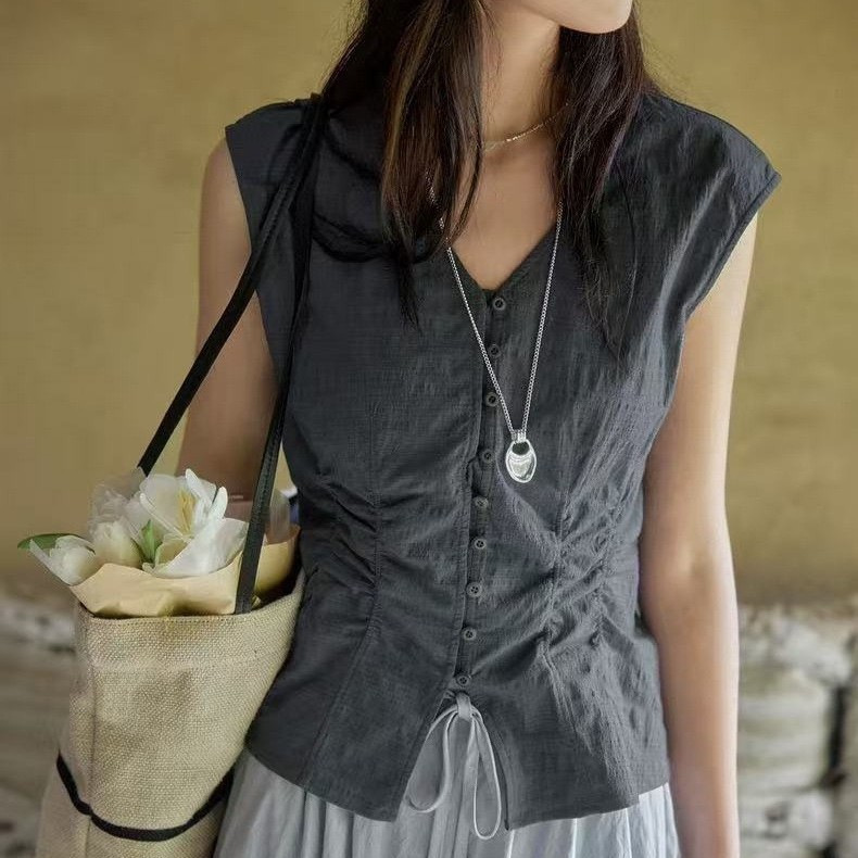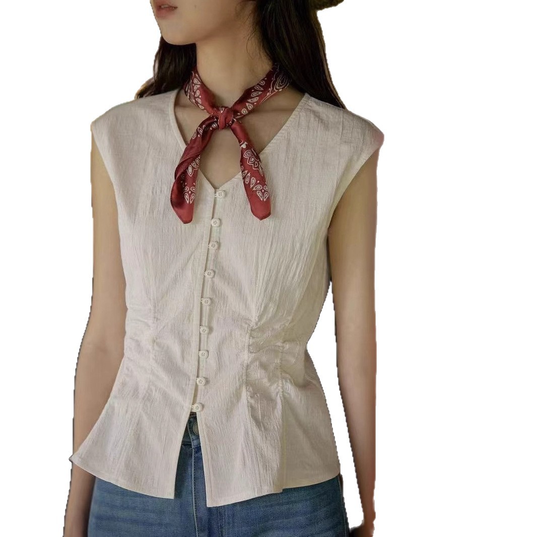 solihgter法式捏褶气质v领收腰衬衫女夏季百搭纯色新款上衣