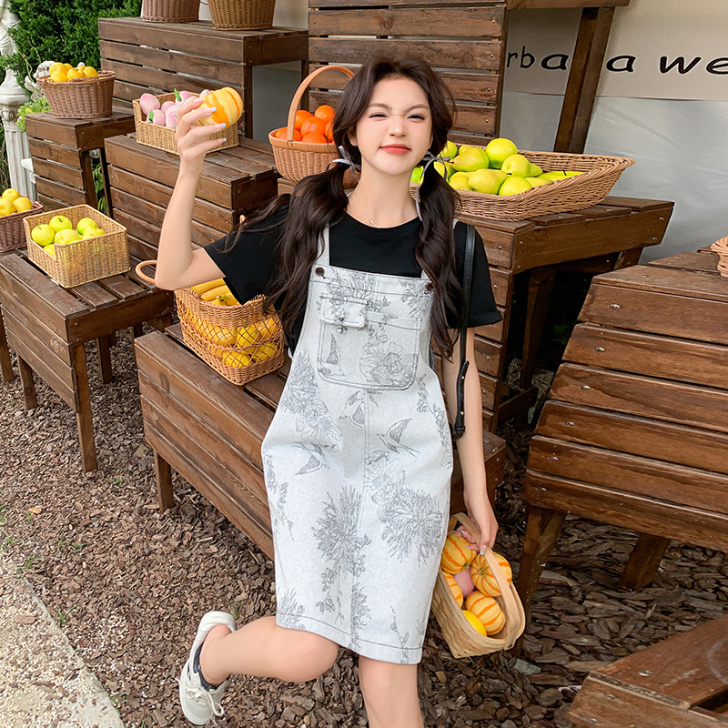 印花牛仔背带裙T恤套装时尚百搭气质小众别致高腰长裙吊带连衣裙