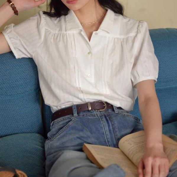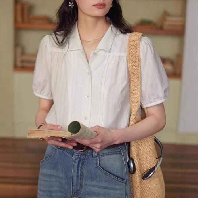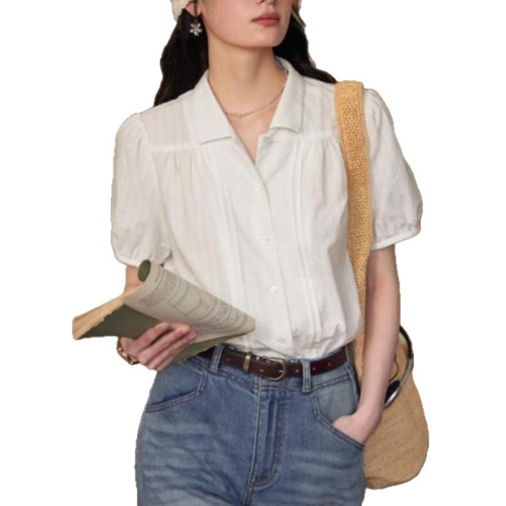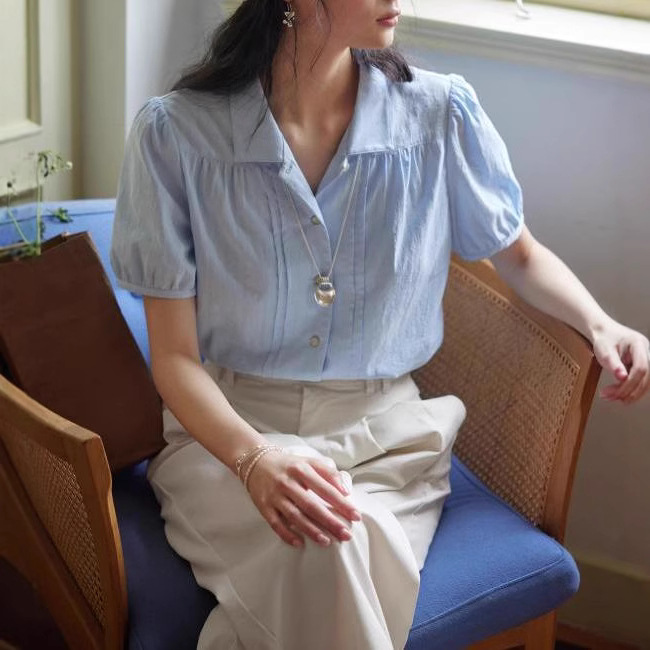 法式蓝色泡泡袖衬衫女夏季2025新款宽松舒适翻领短袖上衣