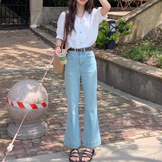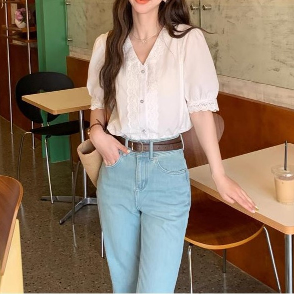 白色v领花边泡泡袖衬衫法式复古显瘦上衣女夏季新款百搭小衫