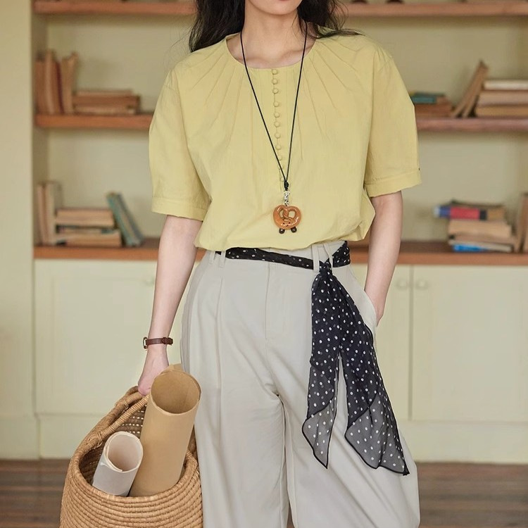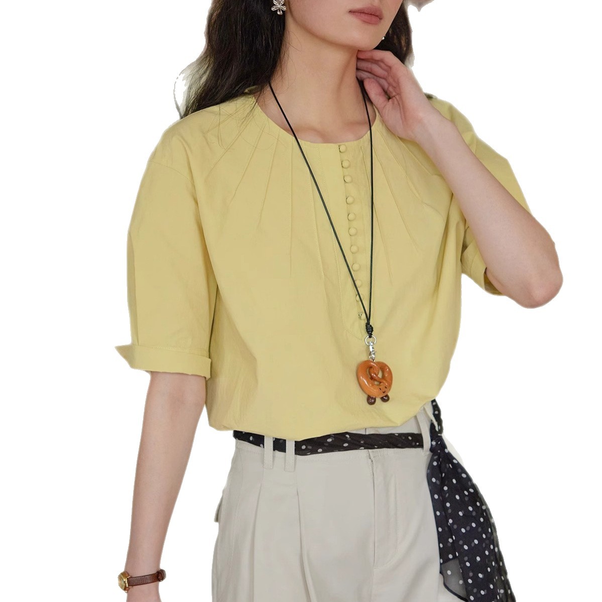 solihgter法式复古黄色圆领中袖衬衫女夏季宽松气质显瘦衬衣上衣