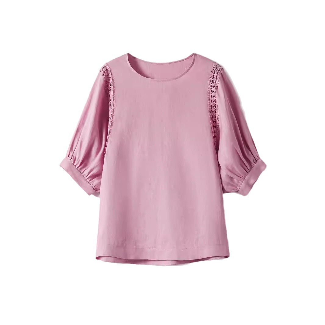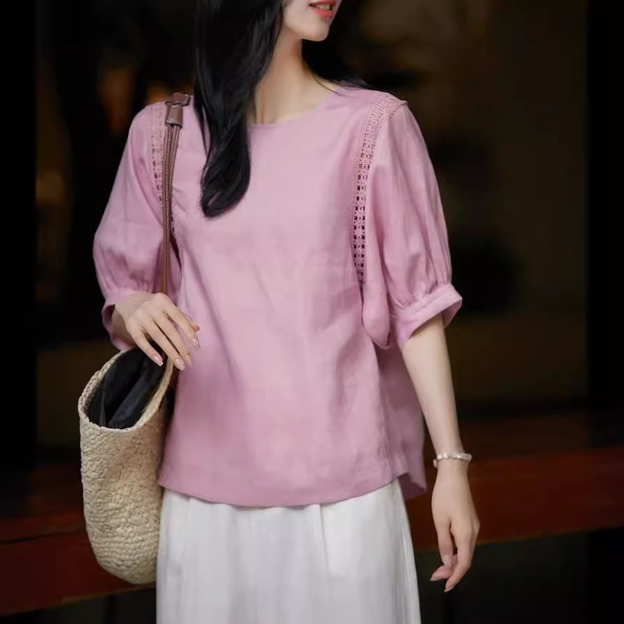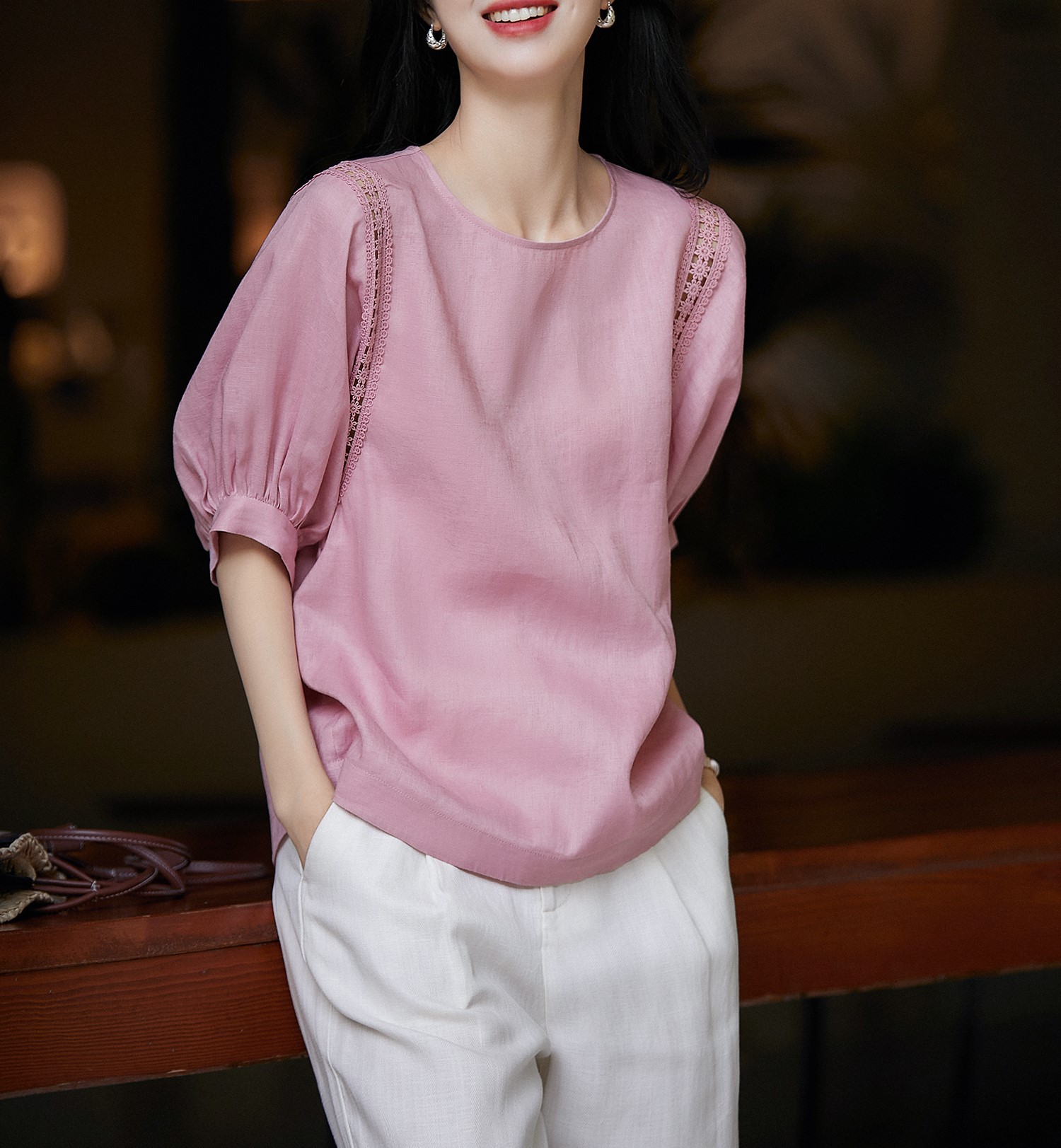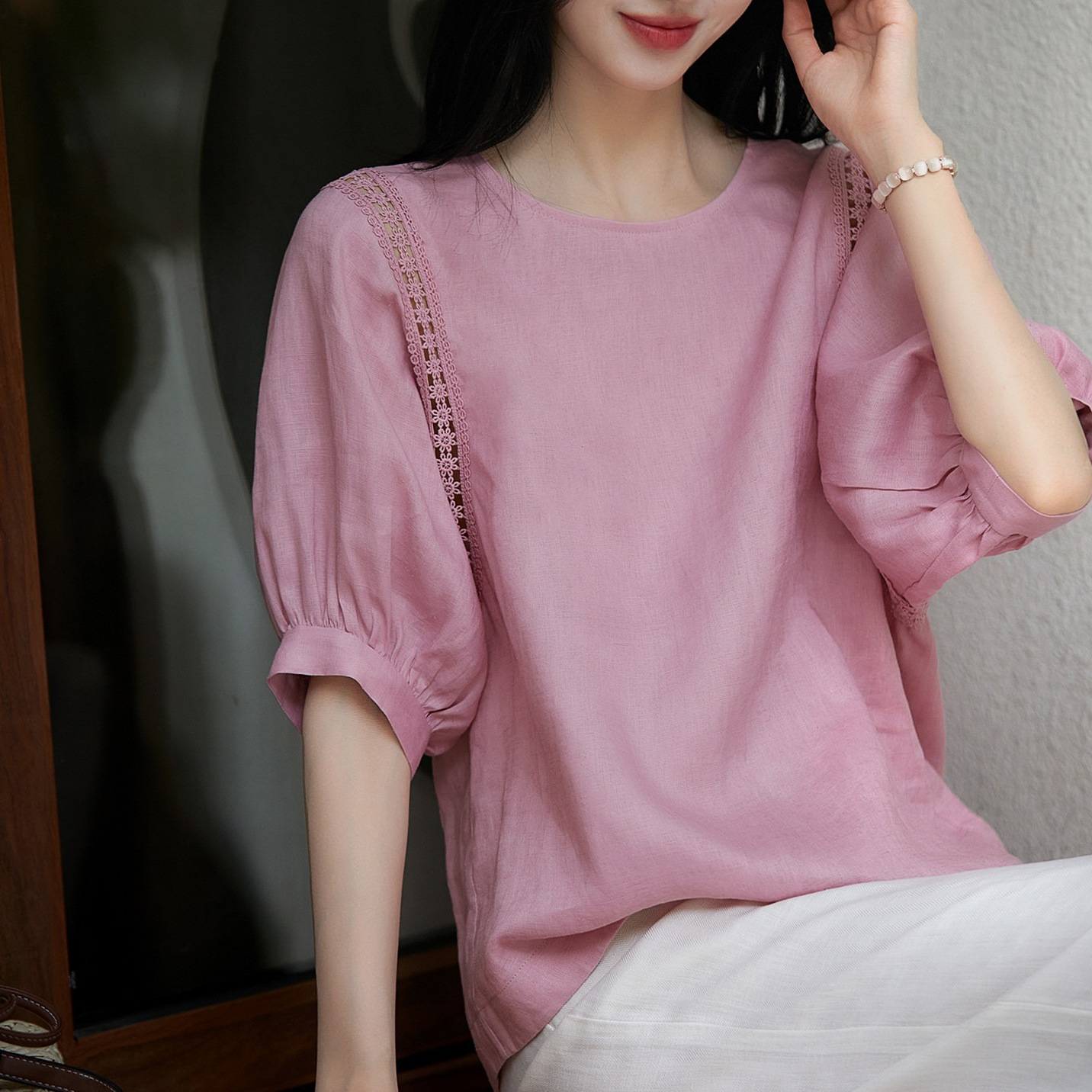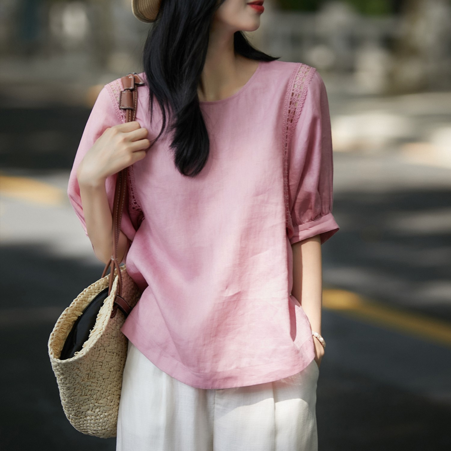 舒适透气呼吸感亚麻桃夭粉灯笼袖小衫短袖上衣夏季女气质新款