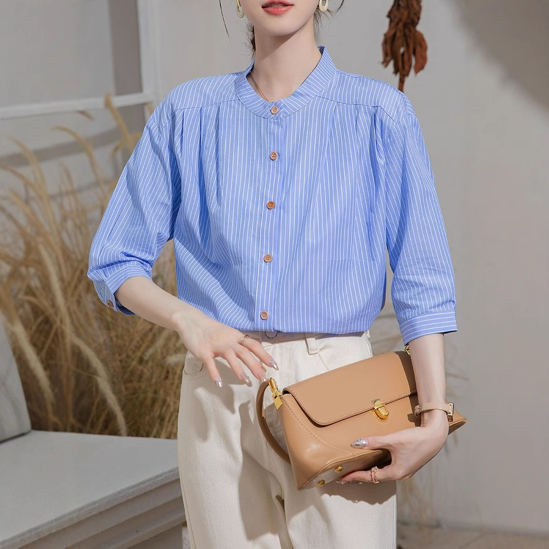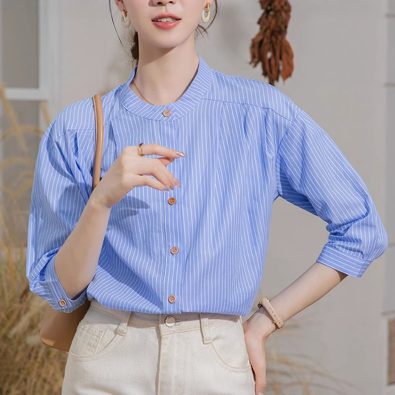 圆领条纹七分袖衬衫女夏季百搭气质休闲宽松显瘦设计感上衣