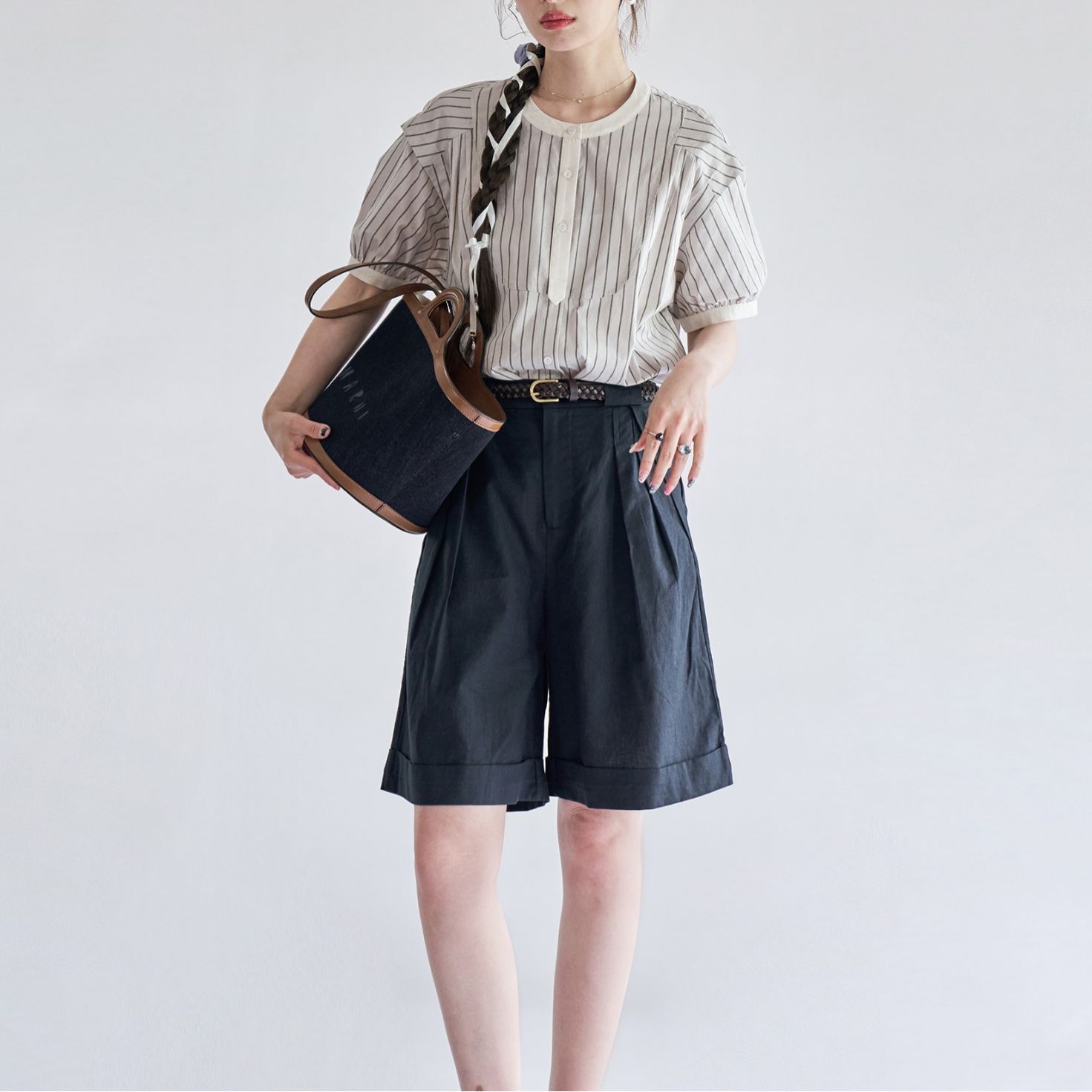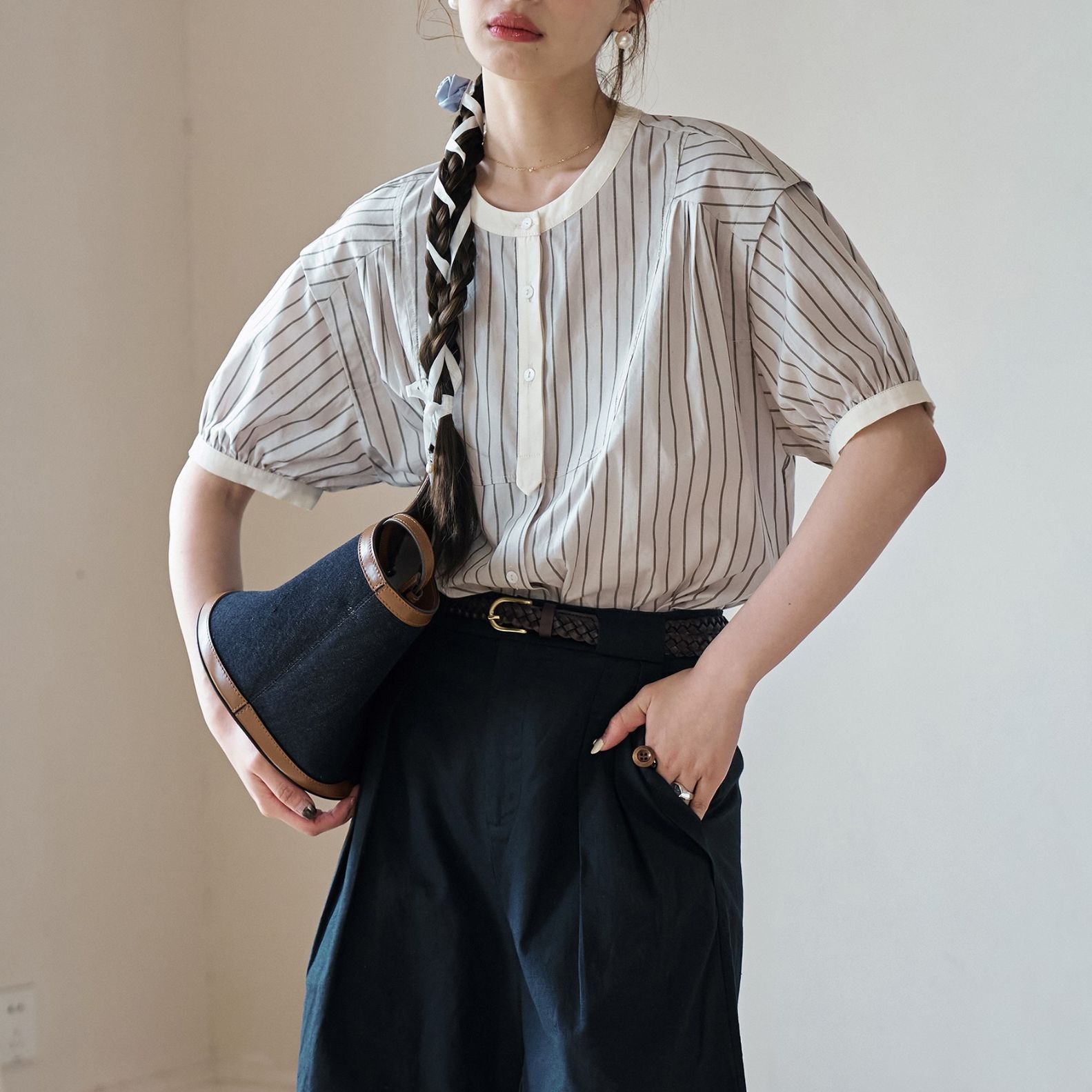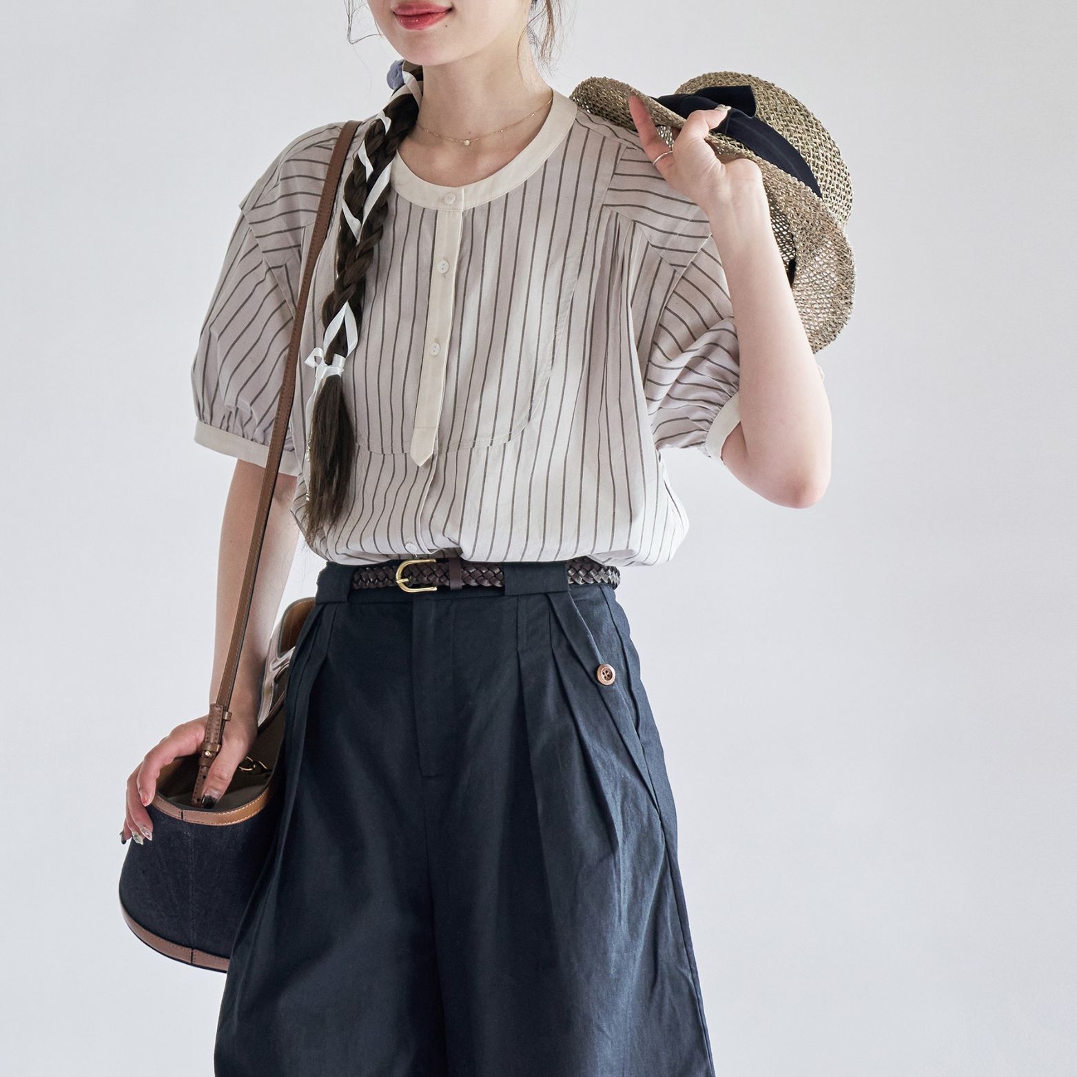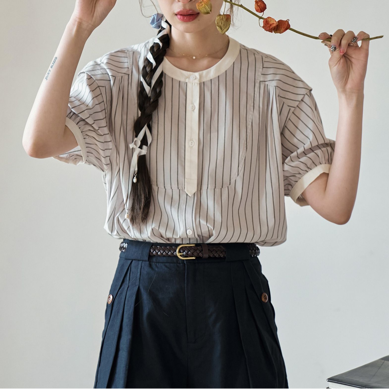 黑白条纹短袖衬衫女夏季法式复古文艺圆领衬衣上衣