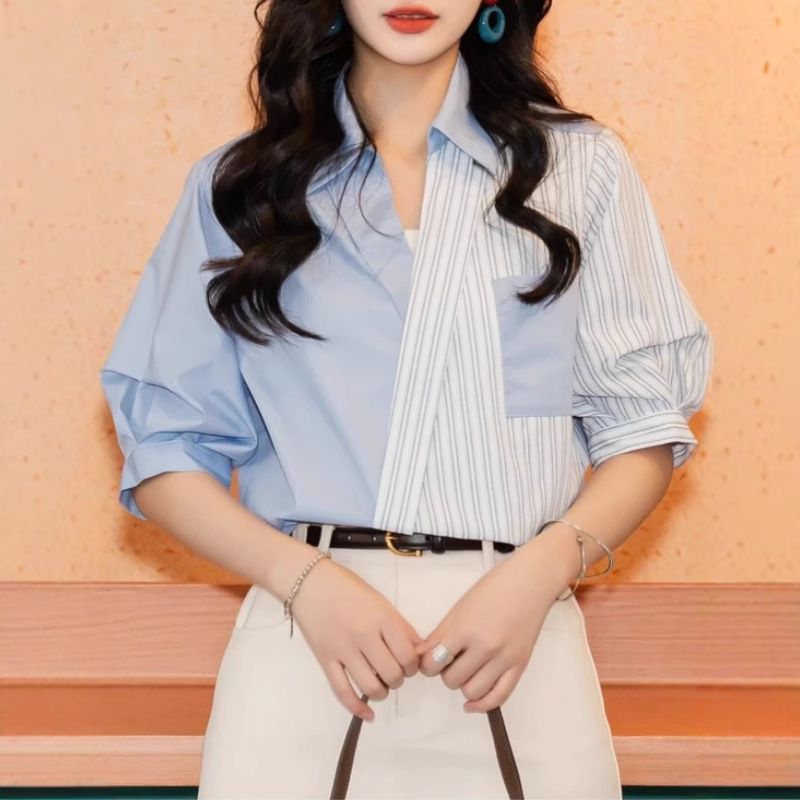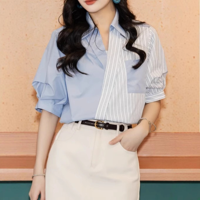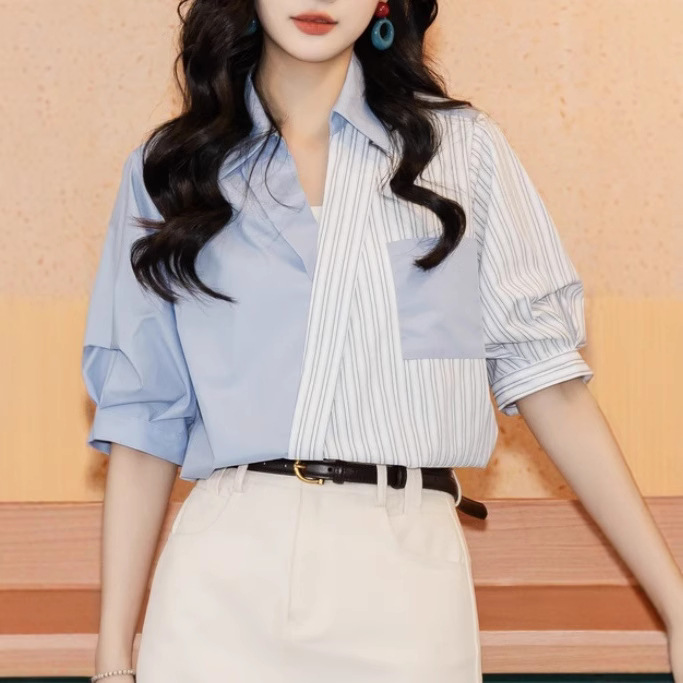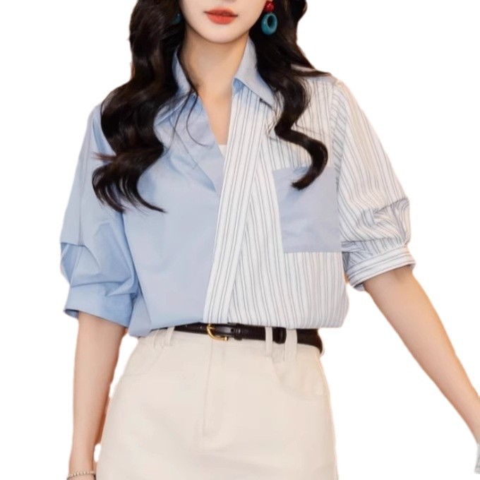 秋天的人手一件衬衫港风复古纯色短袖衬衫女宽松显瘦上衣