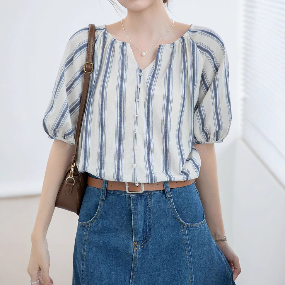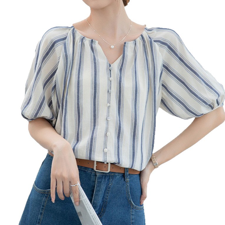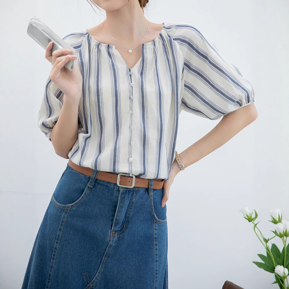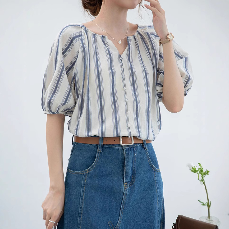 夏季女新款蓝条纹v领气质五分袖设计感短袖衬衫半开领上衣