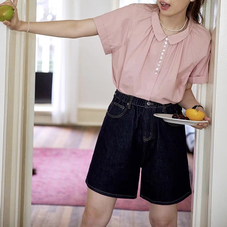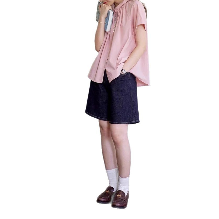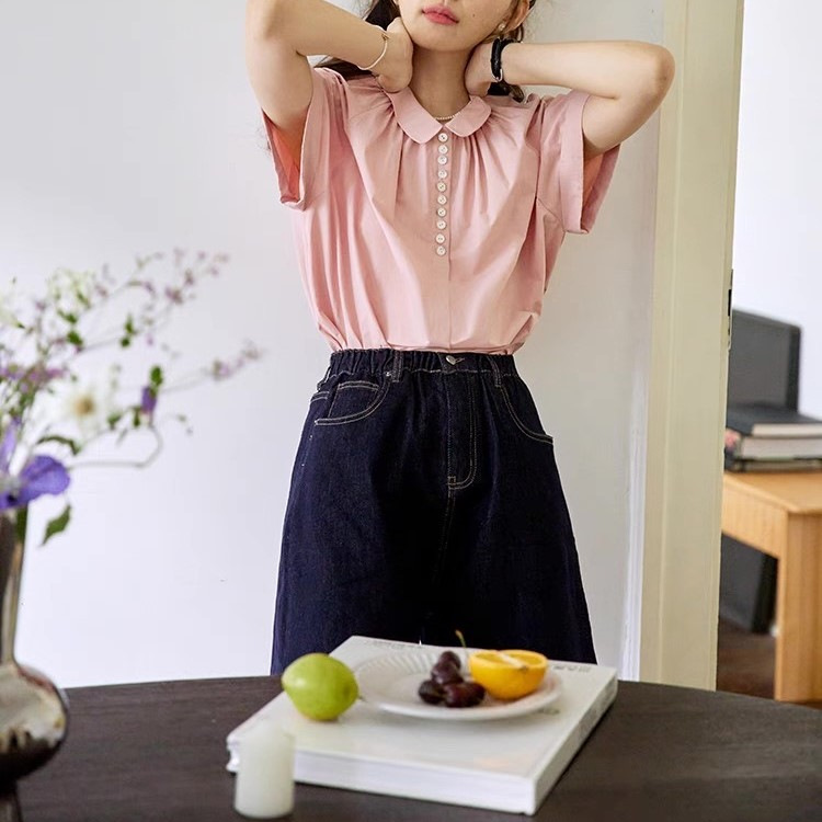 品质推荐~法式复古娃娃领贝壳扣设计感衬衫夏季显瘦短袖女