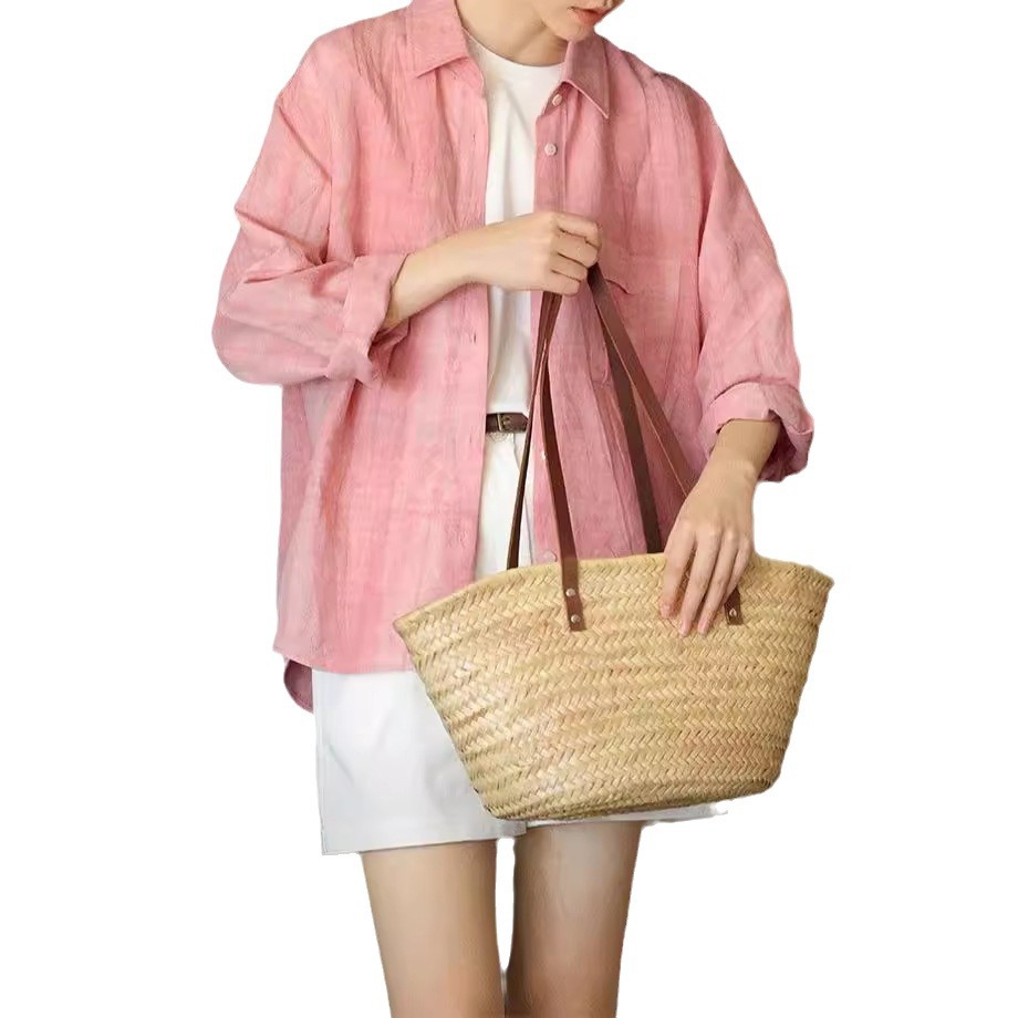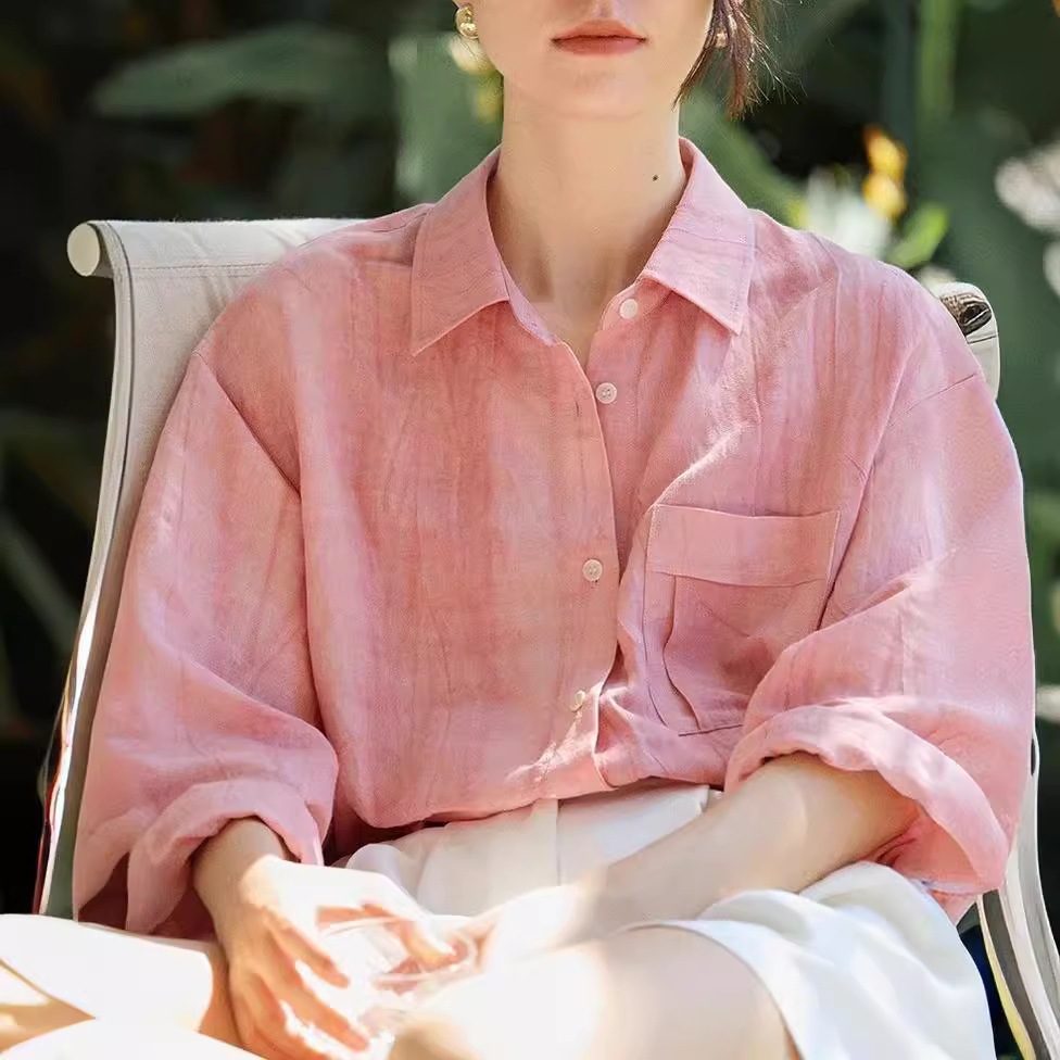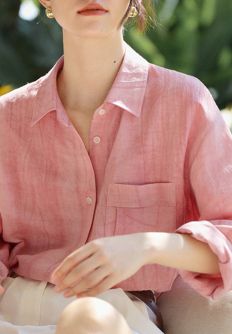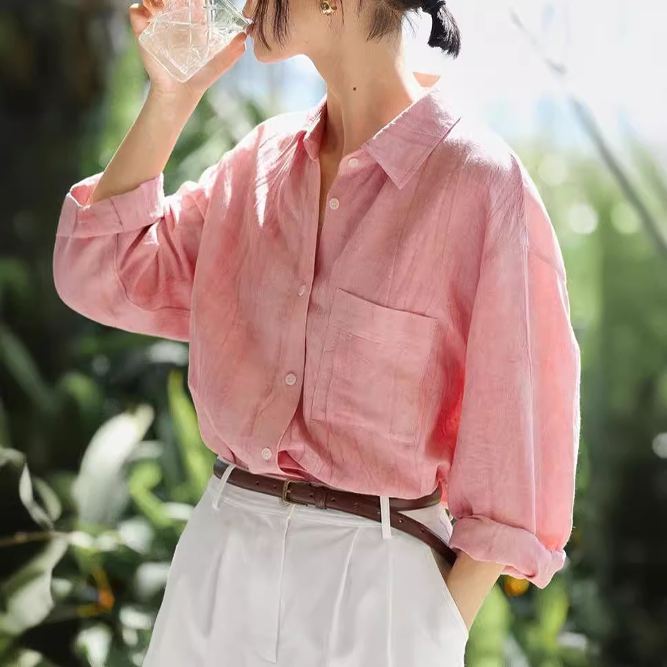 春日来信手工炒色粉色长袖防晒衬衫女春夏显瘦树莓粉上衣