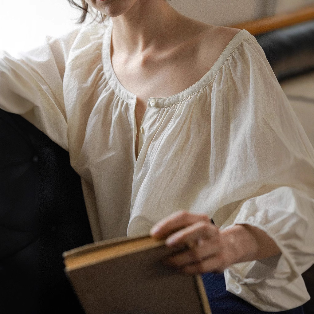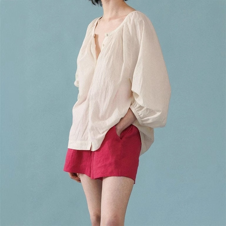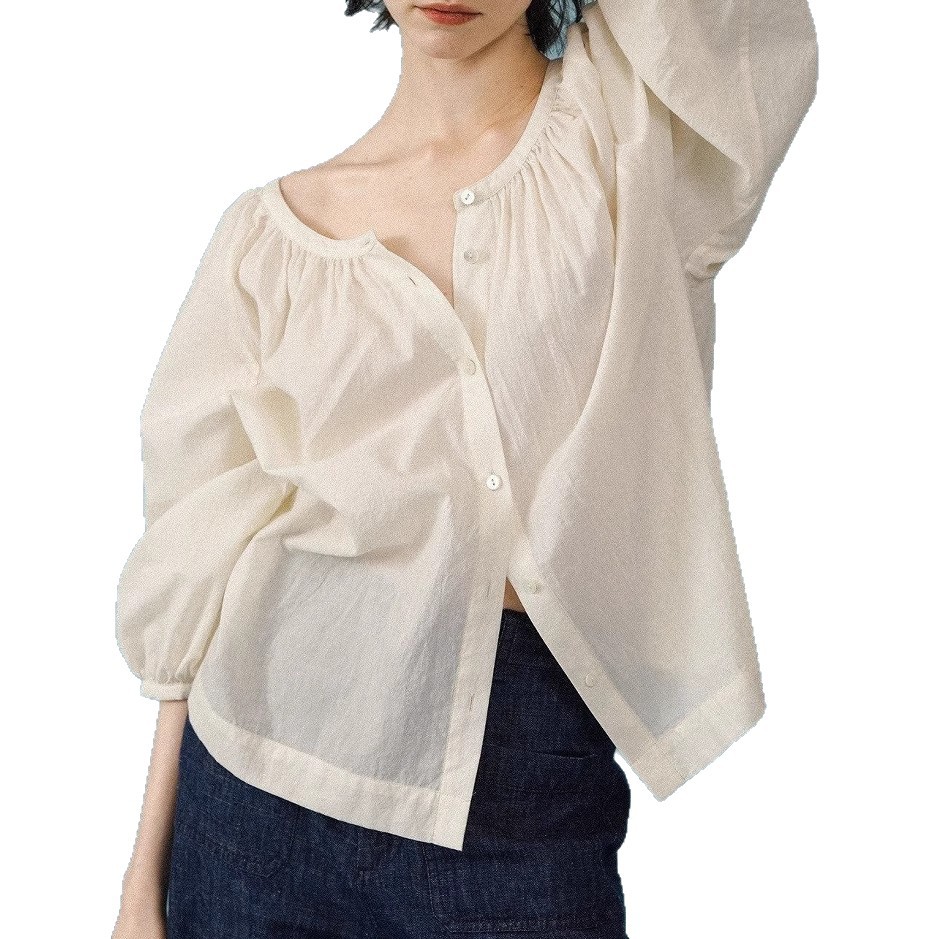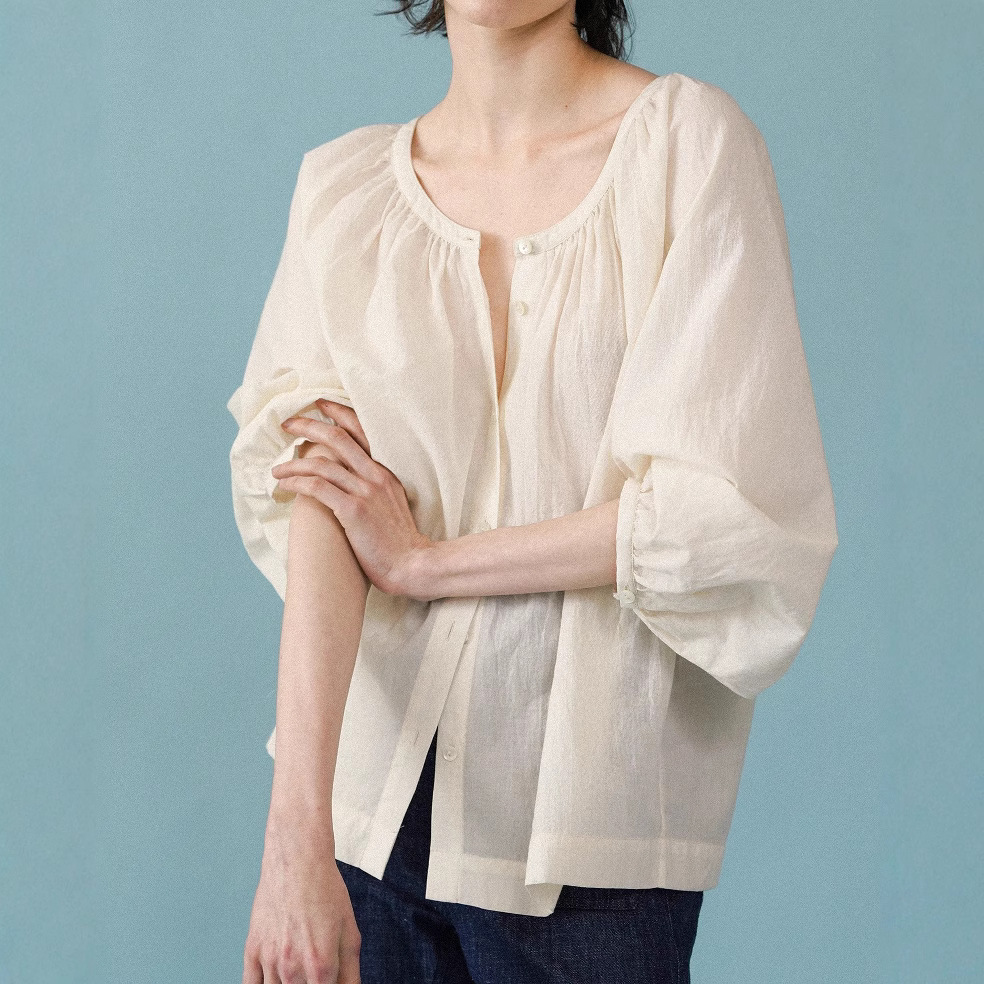 ins store 2025 春夏新品 【浅春】麻棉两色领圈抽褶休闲防晒衬衫