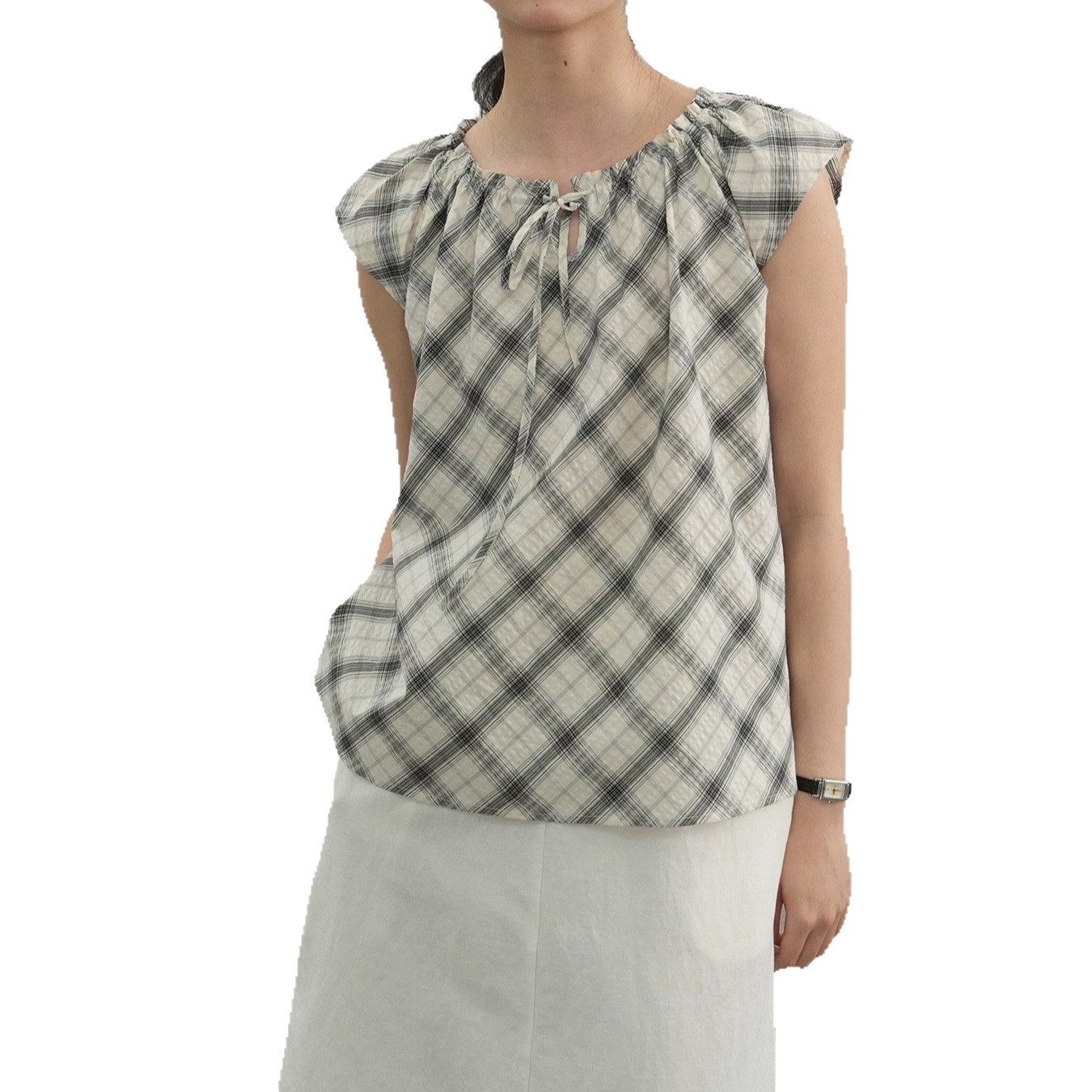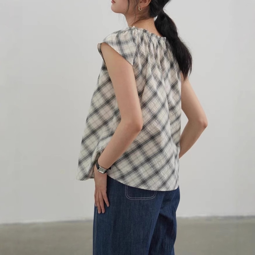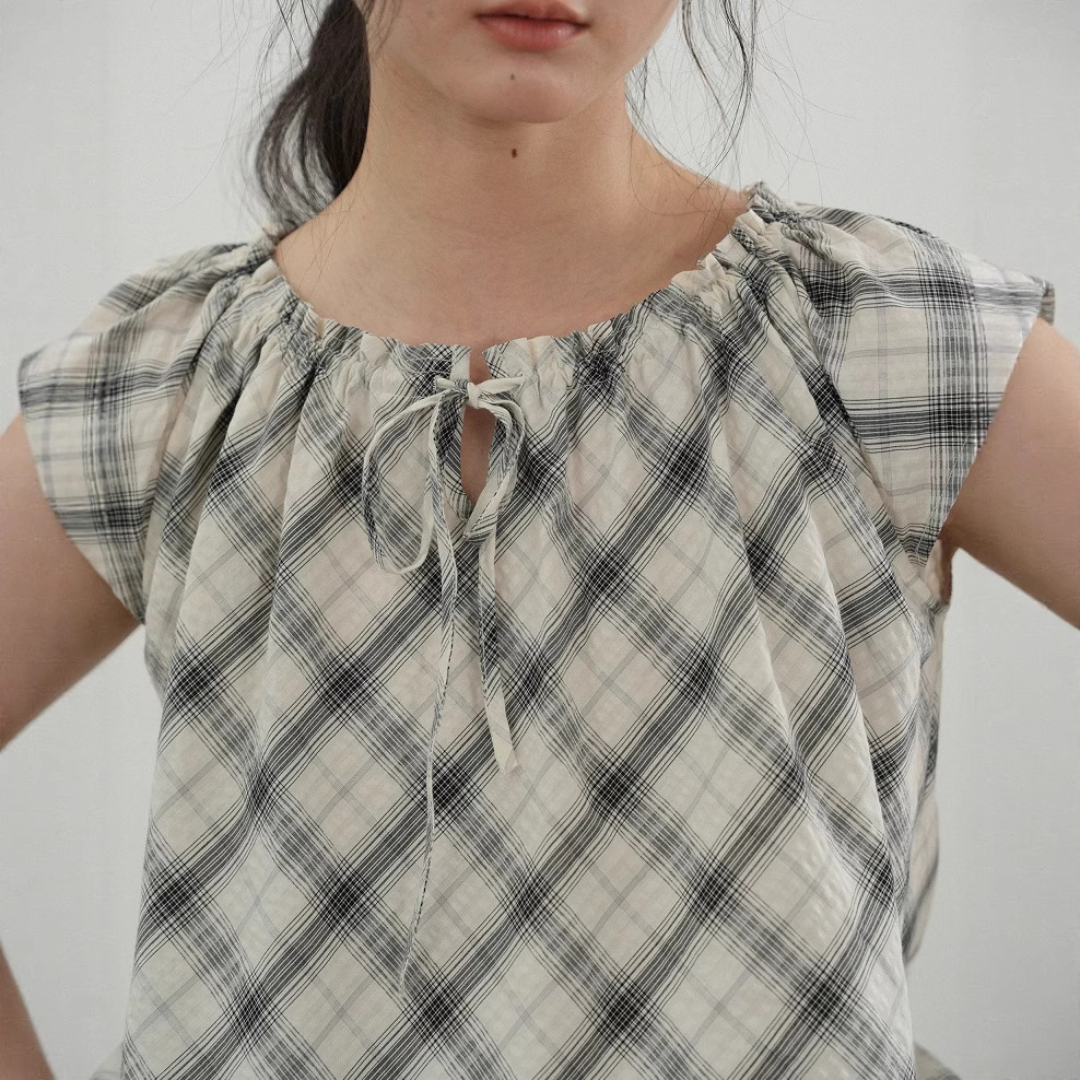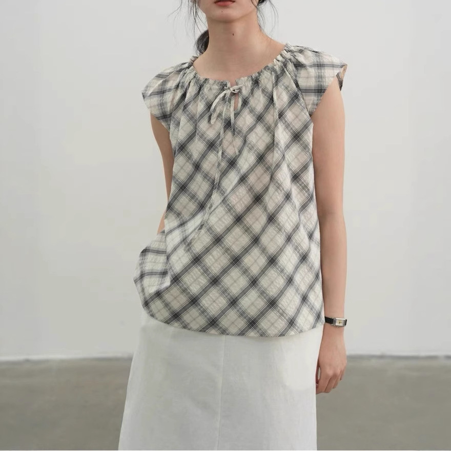 法式复古黑白格子减龄小衫短款小飞袖独特别致上衣女夏季新款