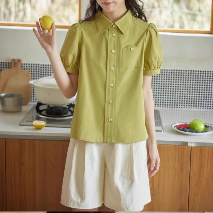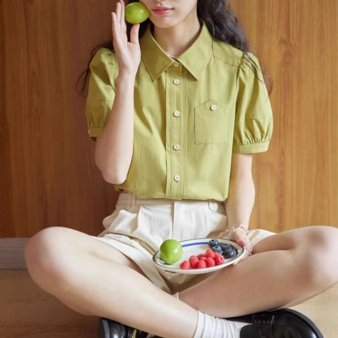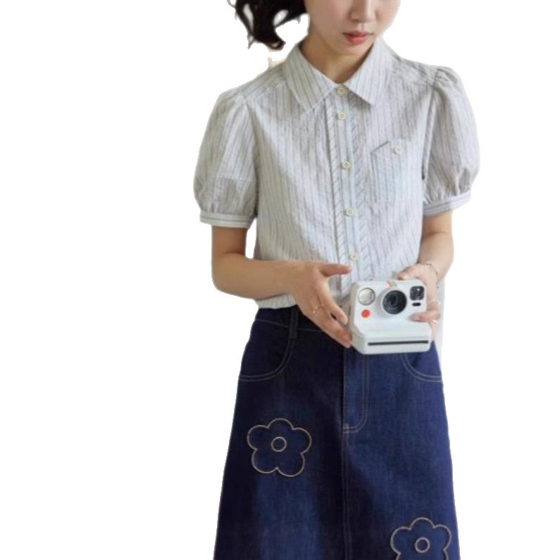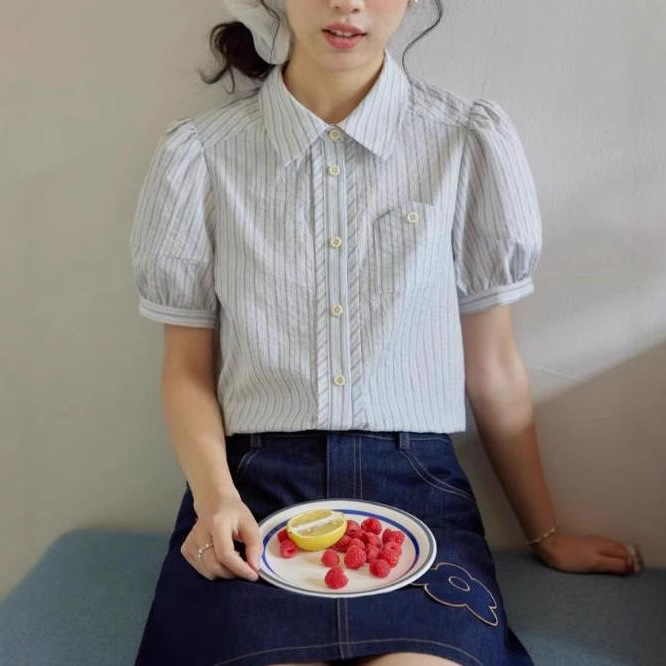 人手一件~法式复古方领分割泡泡袖女夏休闲条纹衬衫宽松短袖衬衣