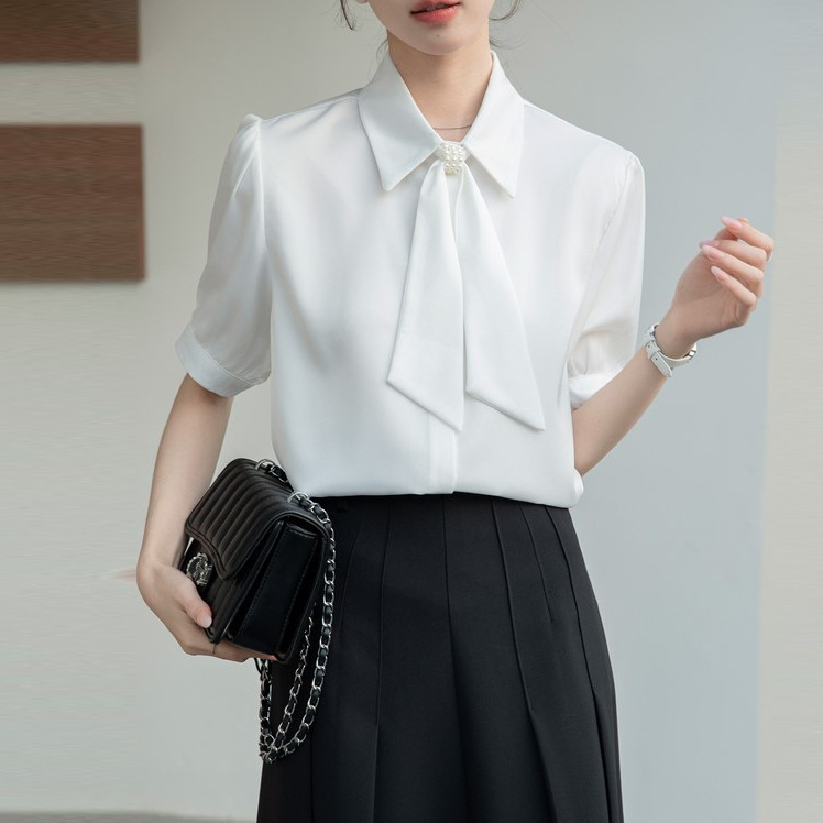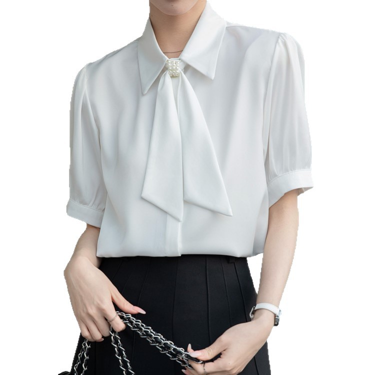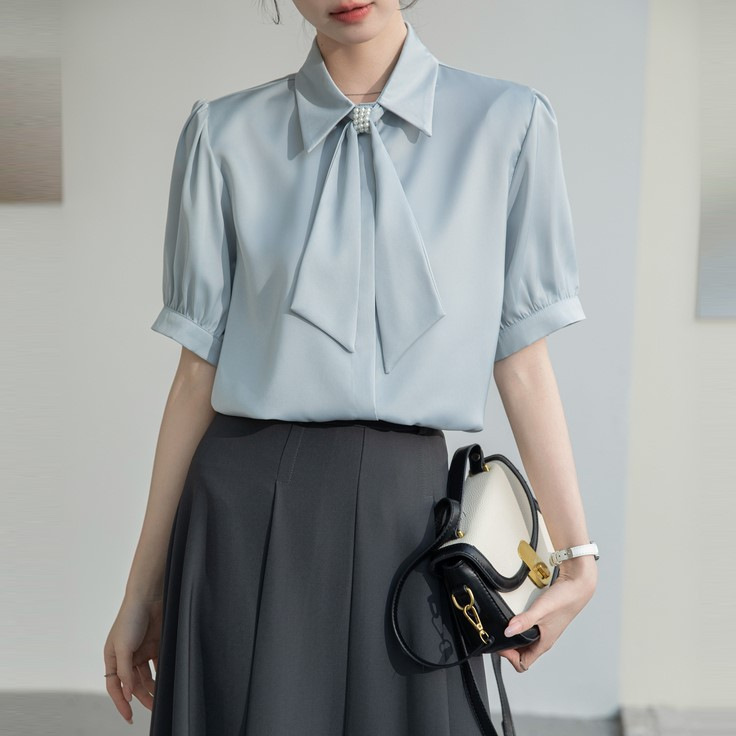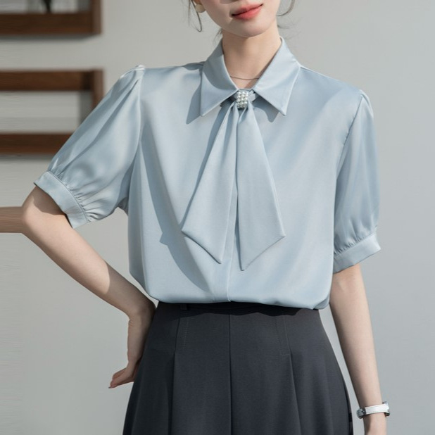 法式蓝色飘带衬衫女夏新款小个子设计感职业装通勤教师教资面试装