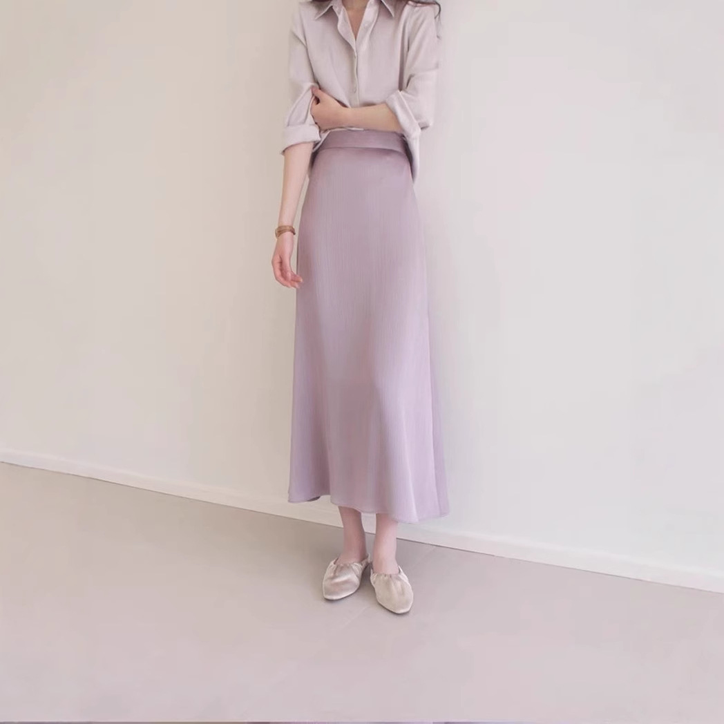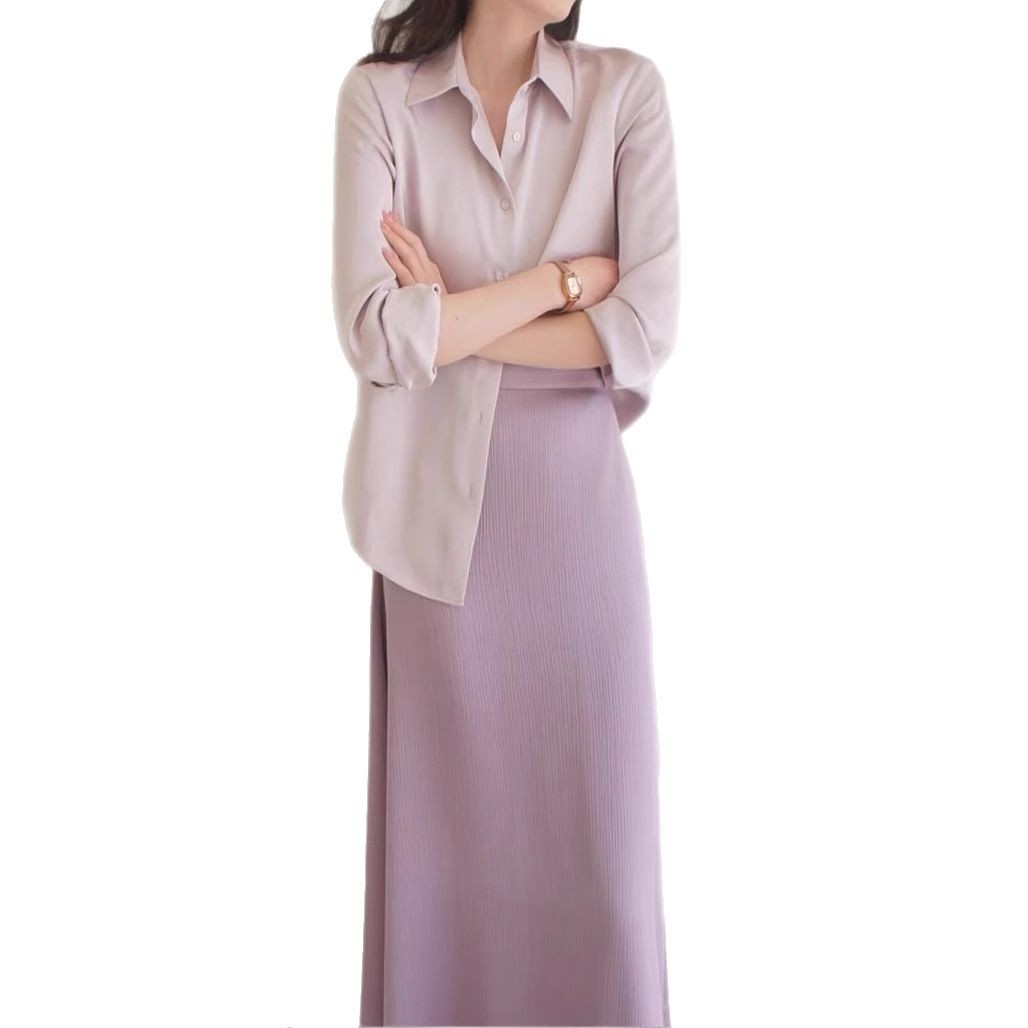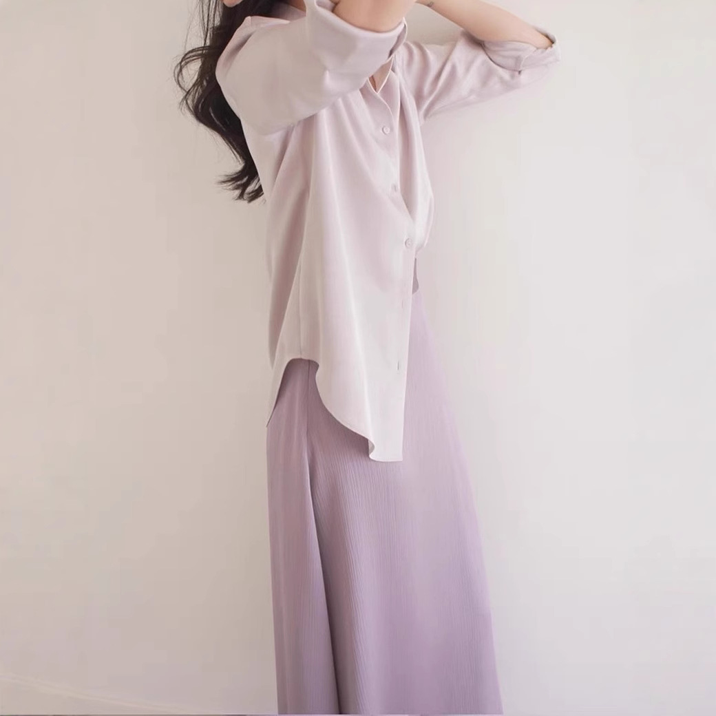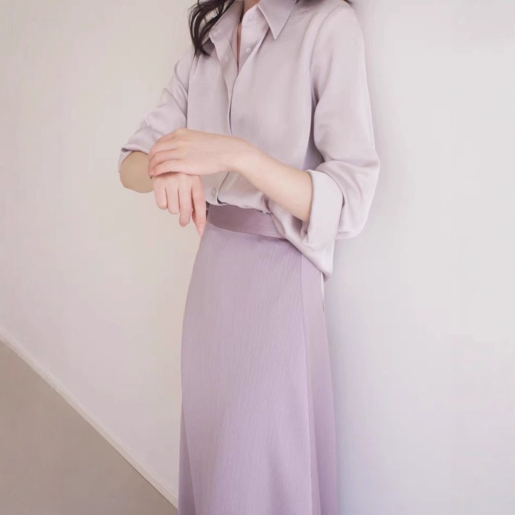 优雅知性~春夏淡淡紫暗纹抓皱缎哑光长袖chic衬衫温柔小清新上衣