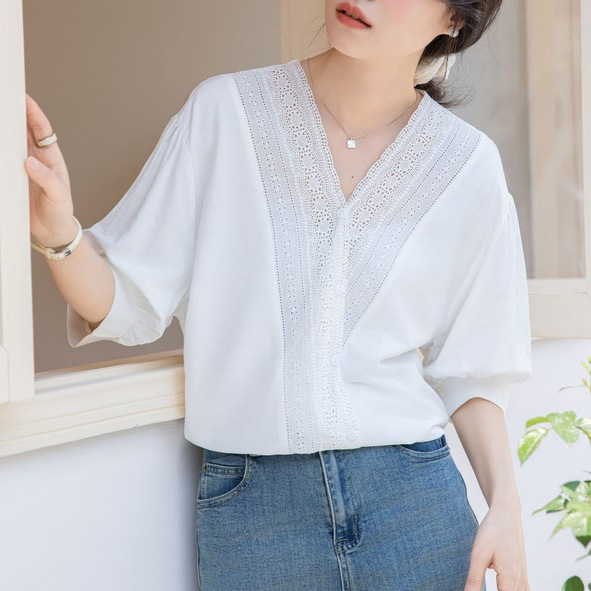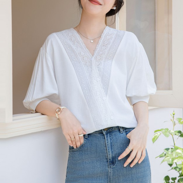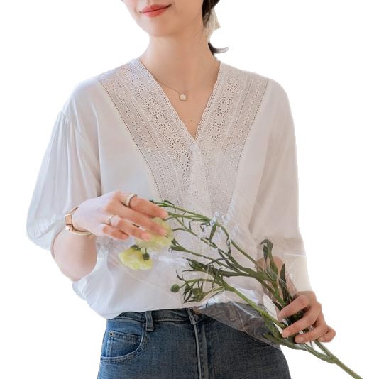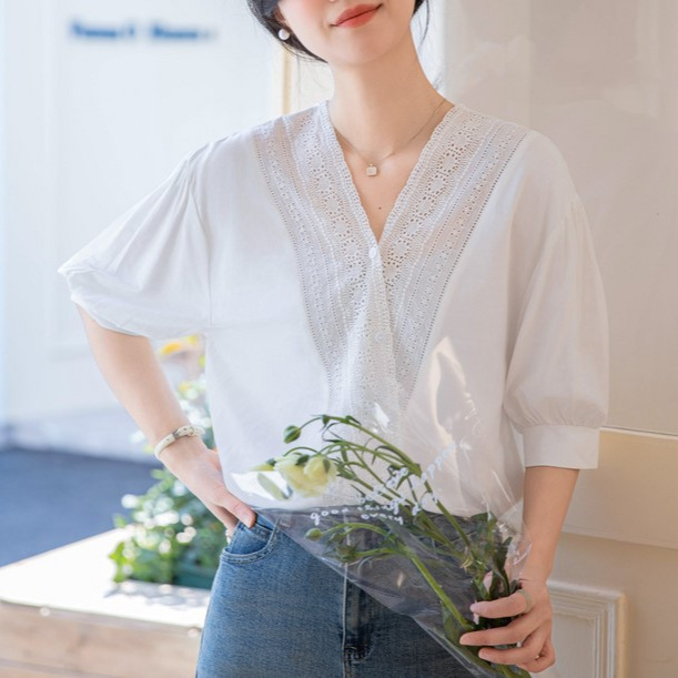 法式白色衬衫女2025夏季新款百搭休闲复古蕾丝V领通勤短袖衬衣