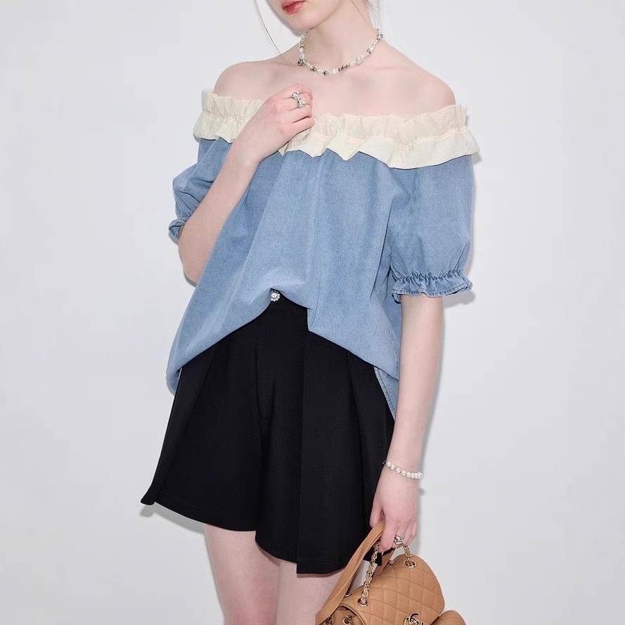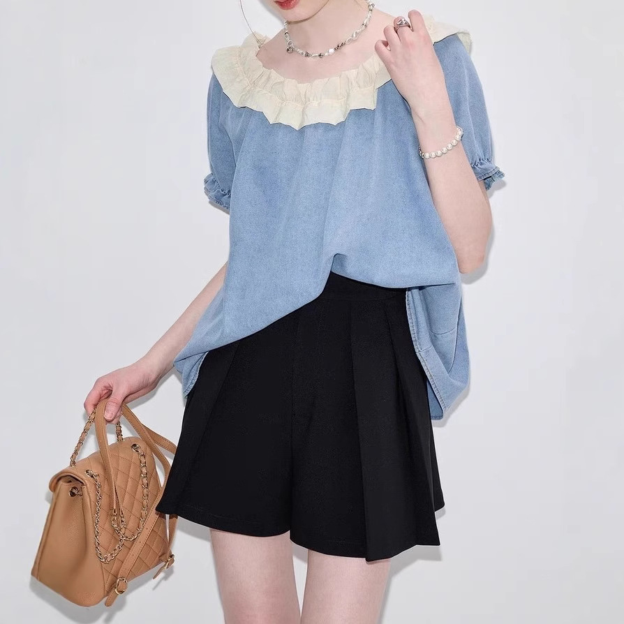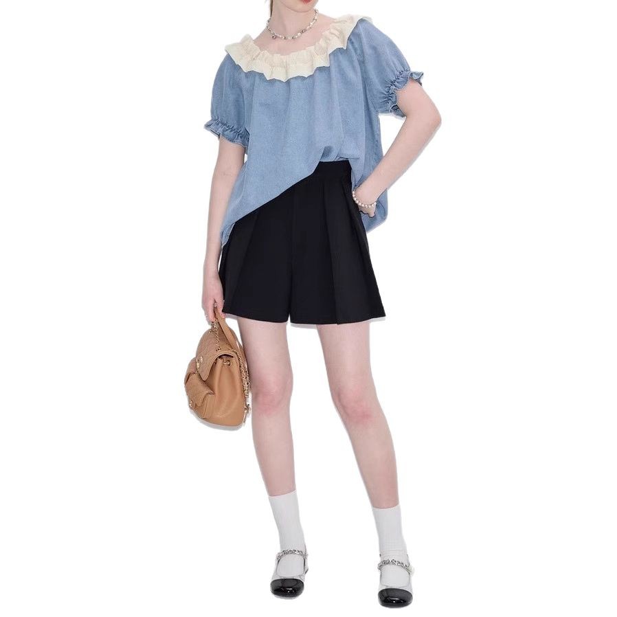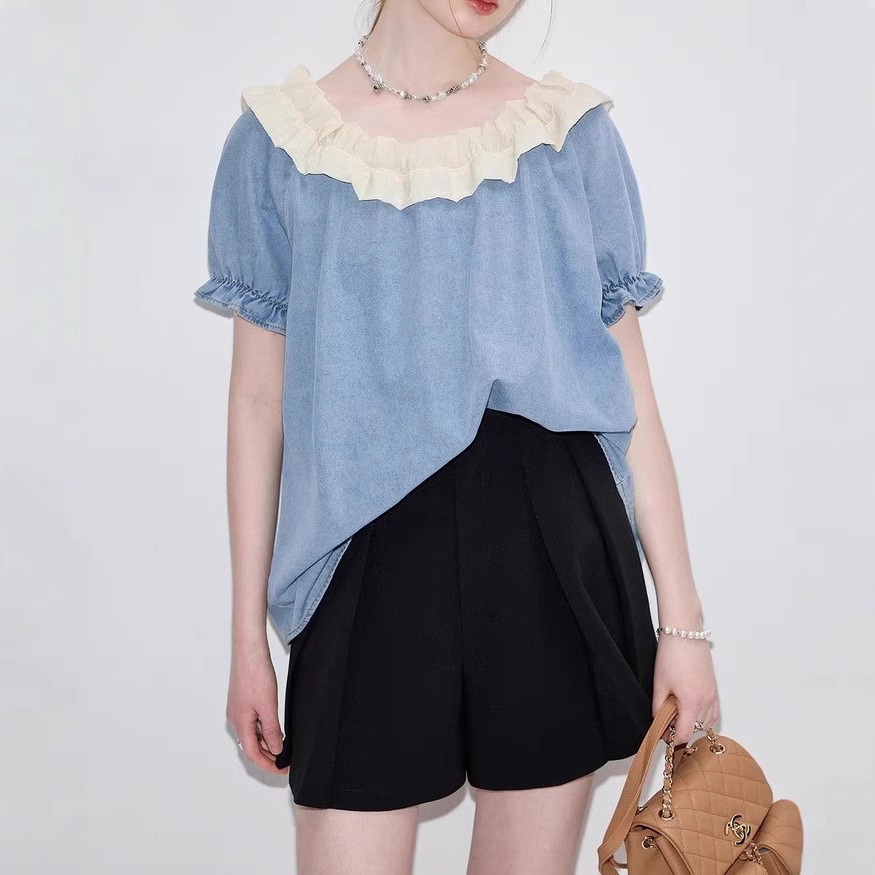 牛仔衬衫女2025年夏季新款法式小众宽松荷叶边圆领短袖上衣