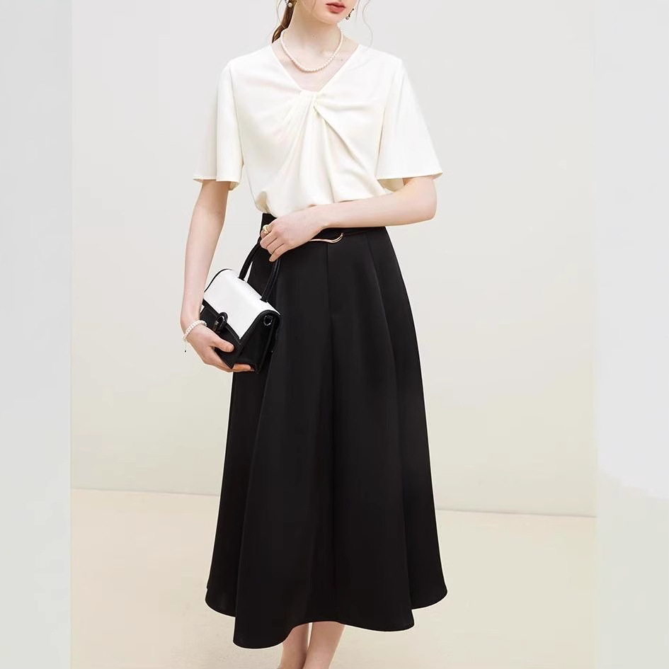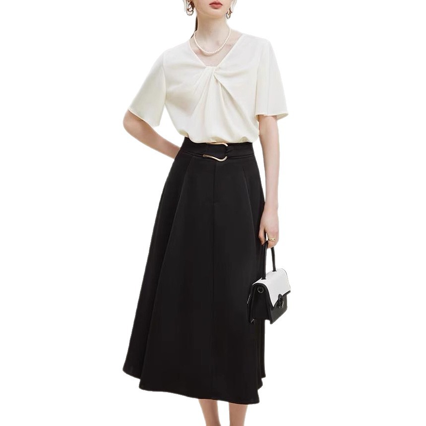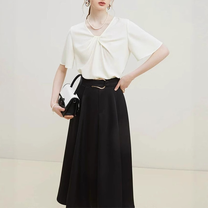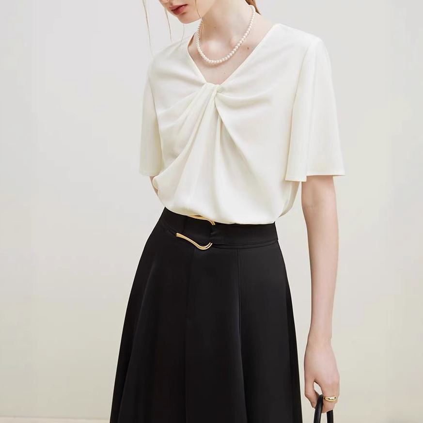 米色V领短袖衬衫女夏款设计感小众气质扭结雪纺上衣