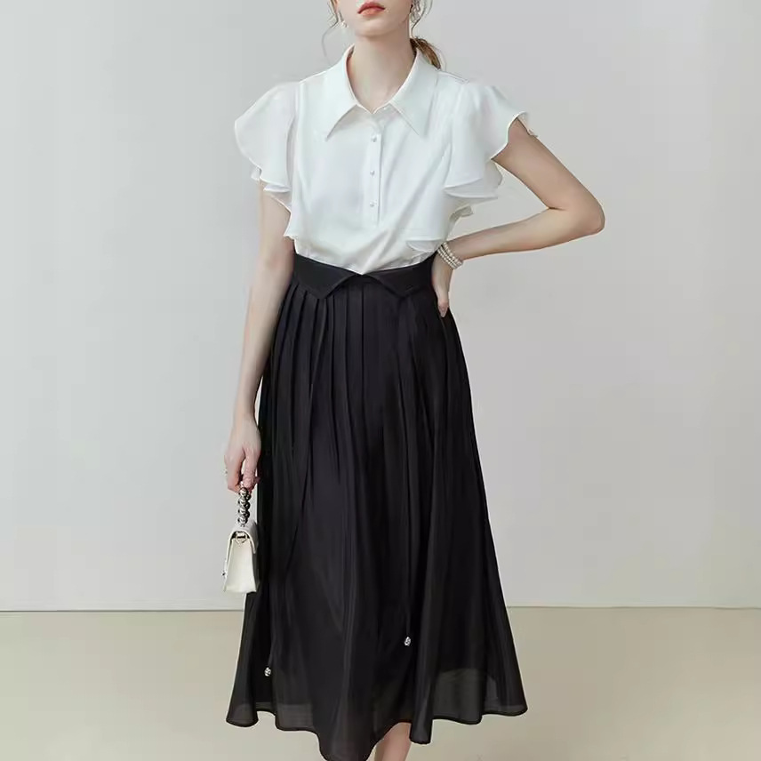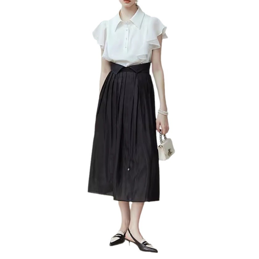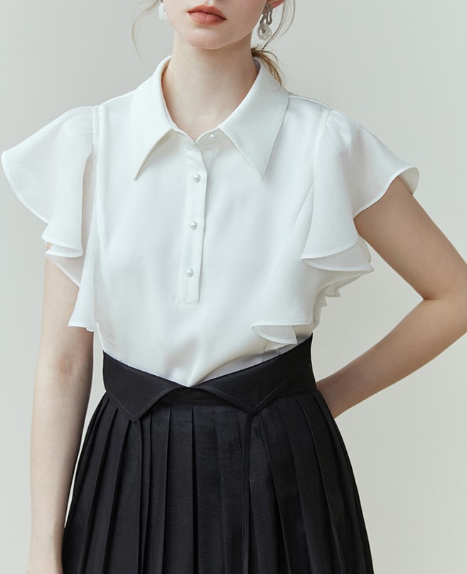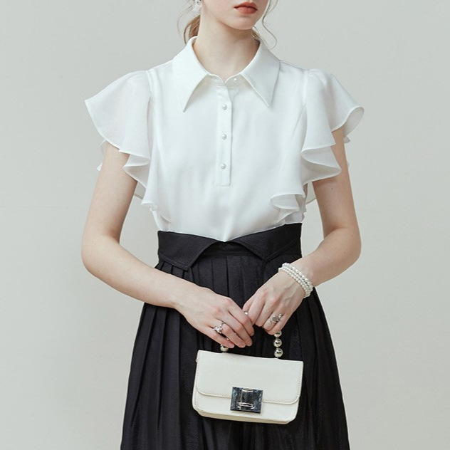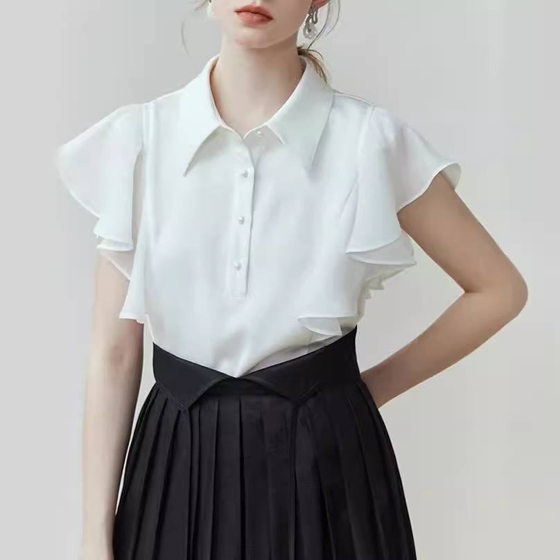 白色荷叶边衬衫女夏新款polo领小飞袖上衣