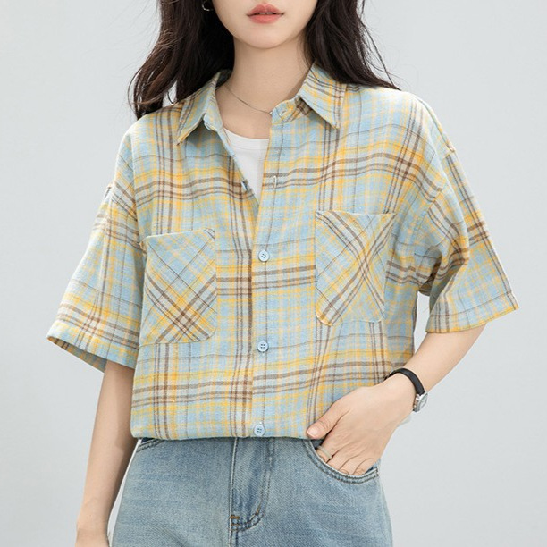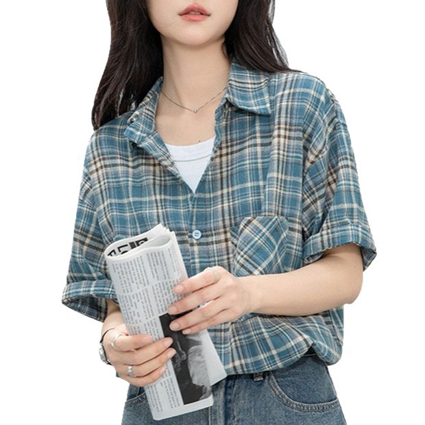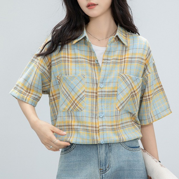 气质绝佳~格子衬衫宽松Polo领通勒短袖上衣衬衫女夏季新款