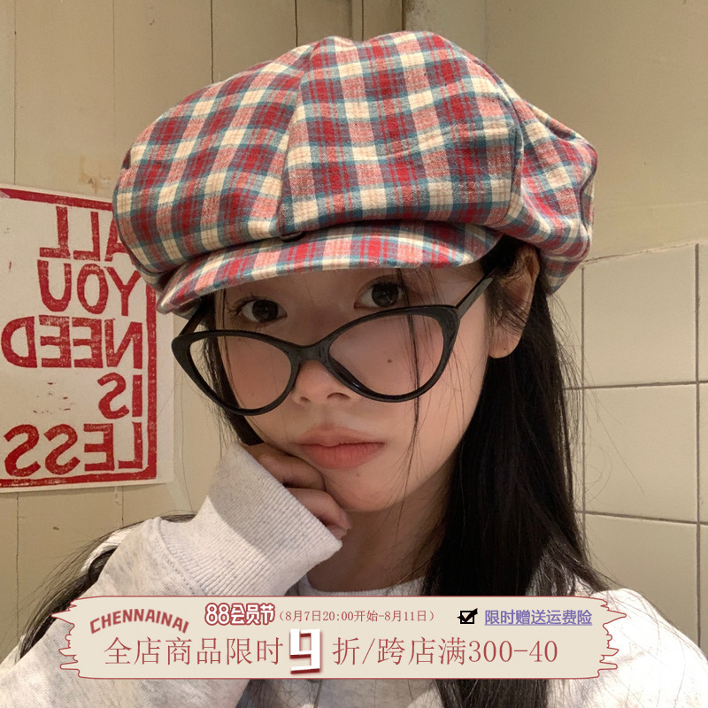 复古画报~日系氛围感格纹云朵八角帽女报童帽子百搭显脸小贝雷帽
