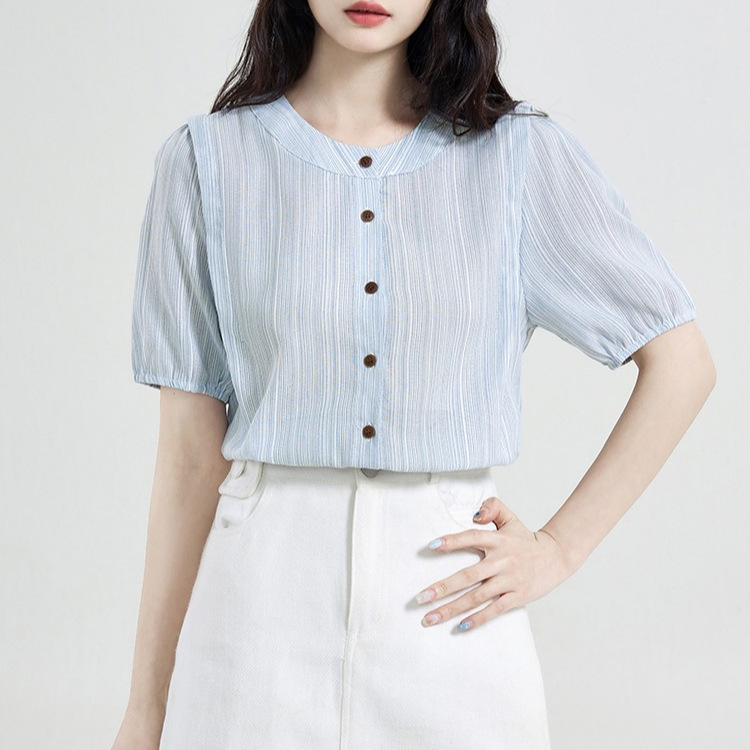 2025新款夏季女设计感衬衣泡泡袖气质蓝色条纹短袖衬衫上衣
