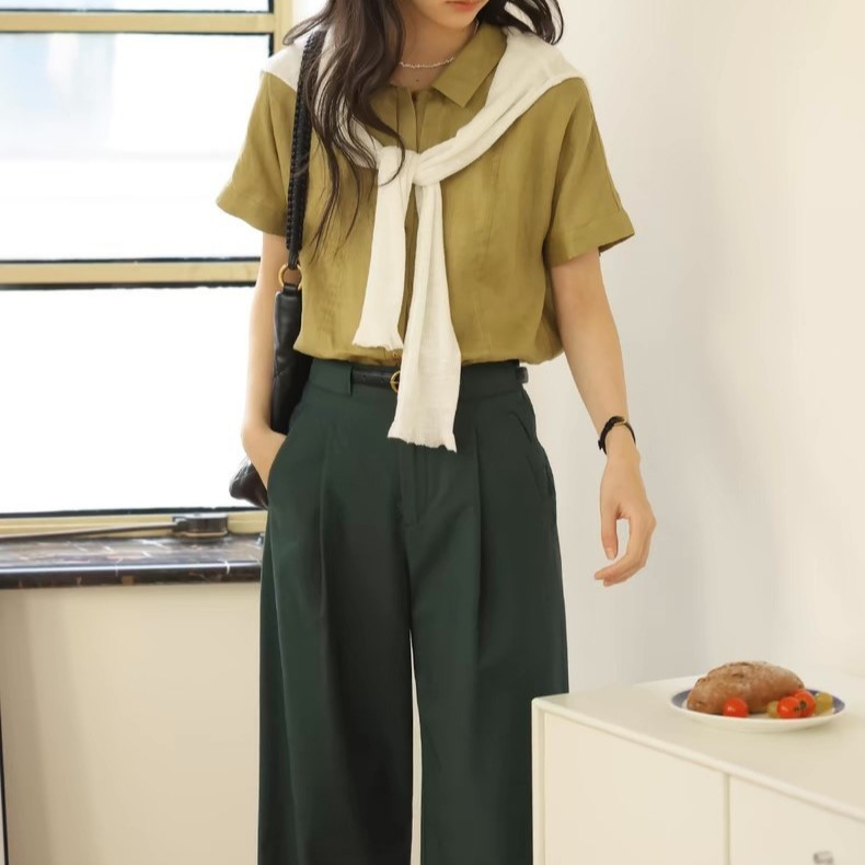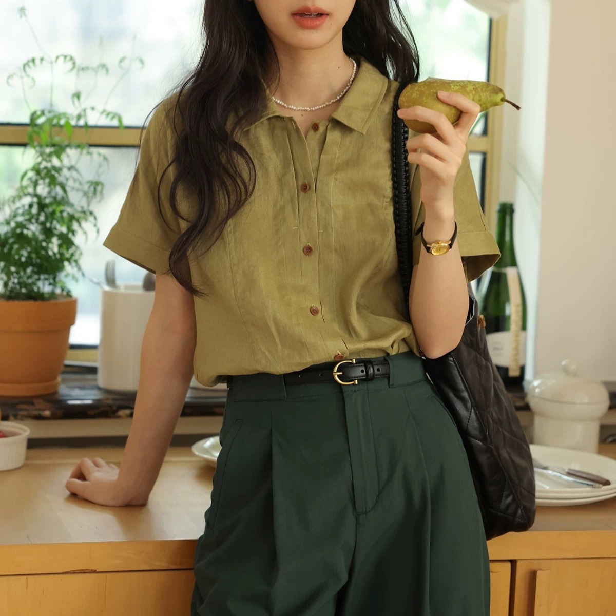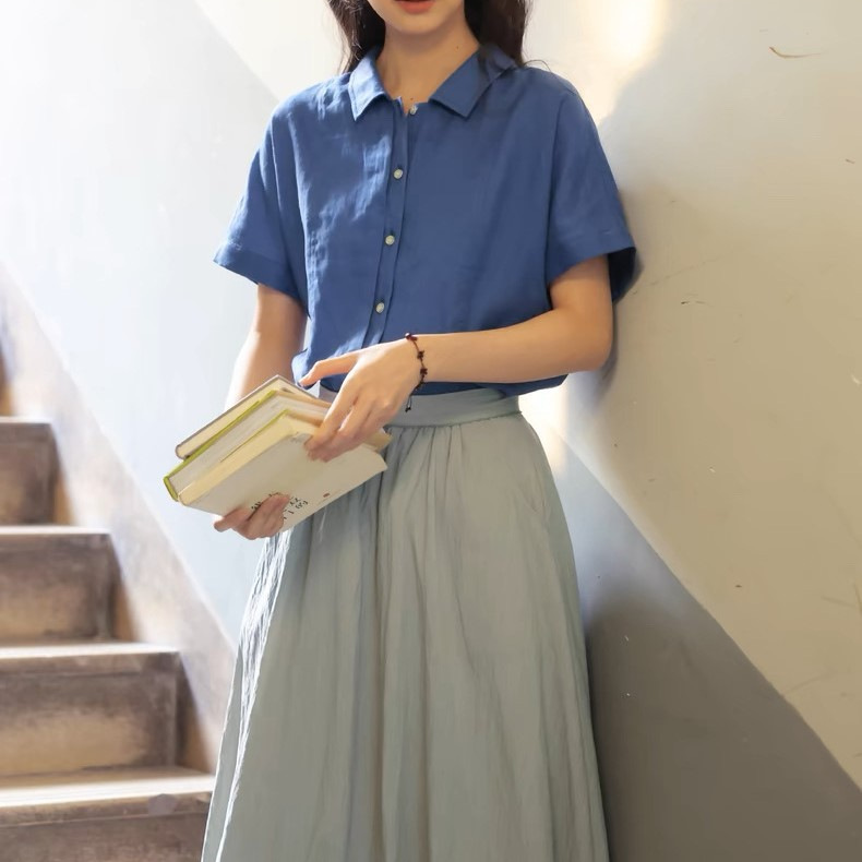 solihgter法式复古亚麻连袖衬衫女夏季2025新款显瘦短袖衬衣上衣