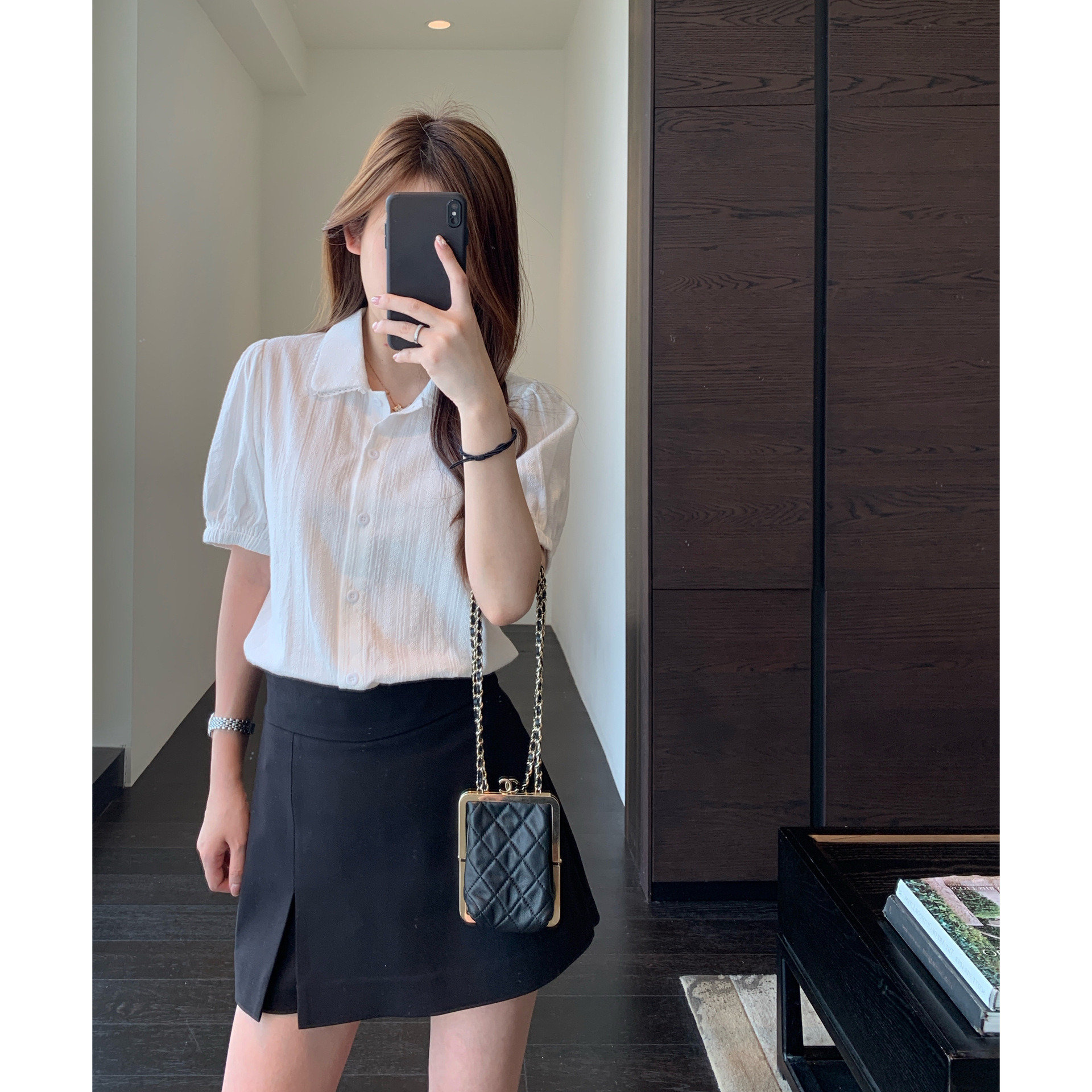 AMR UU◆韩系温柔 蕾丝花边显瘦上衣减龄泡泡袖衬衫女短袖春夏新