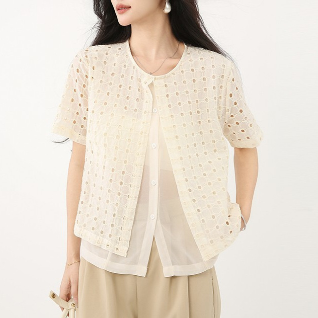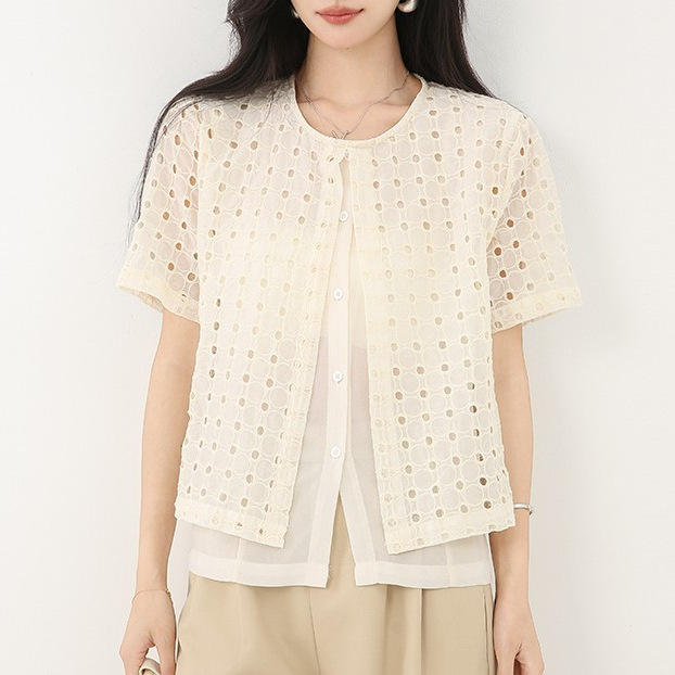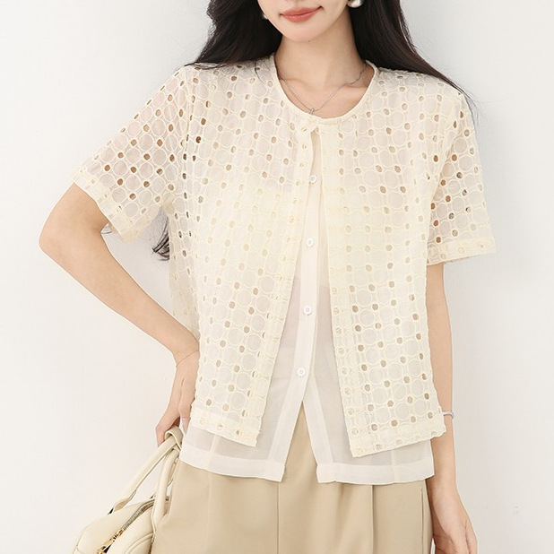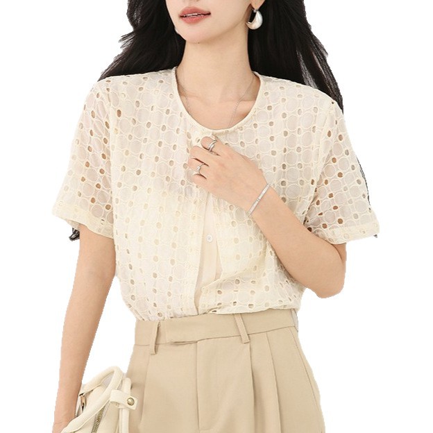 强烈推荐~假两件短袖衬衫女夏2025新款时尚小众钩花镂空衬衣上衣