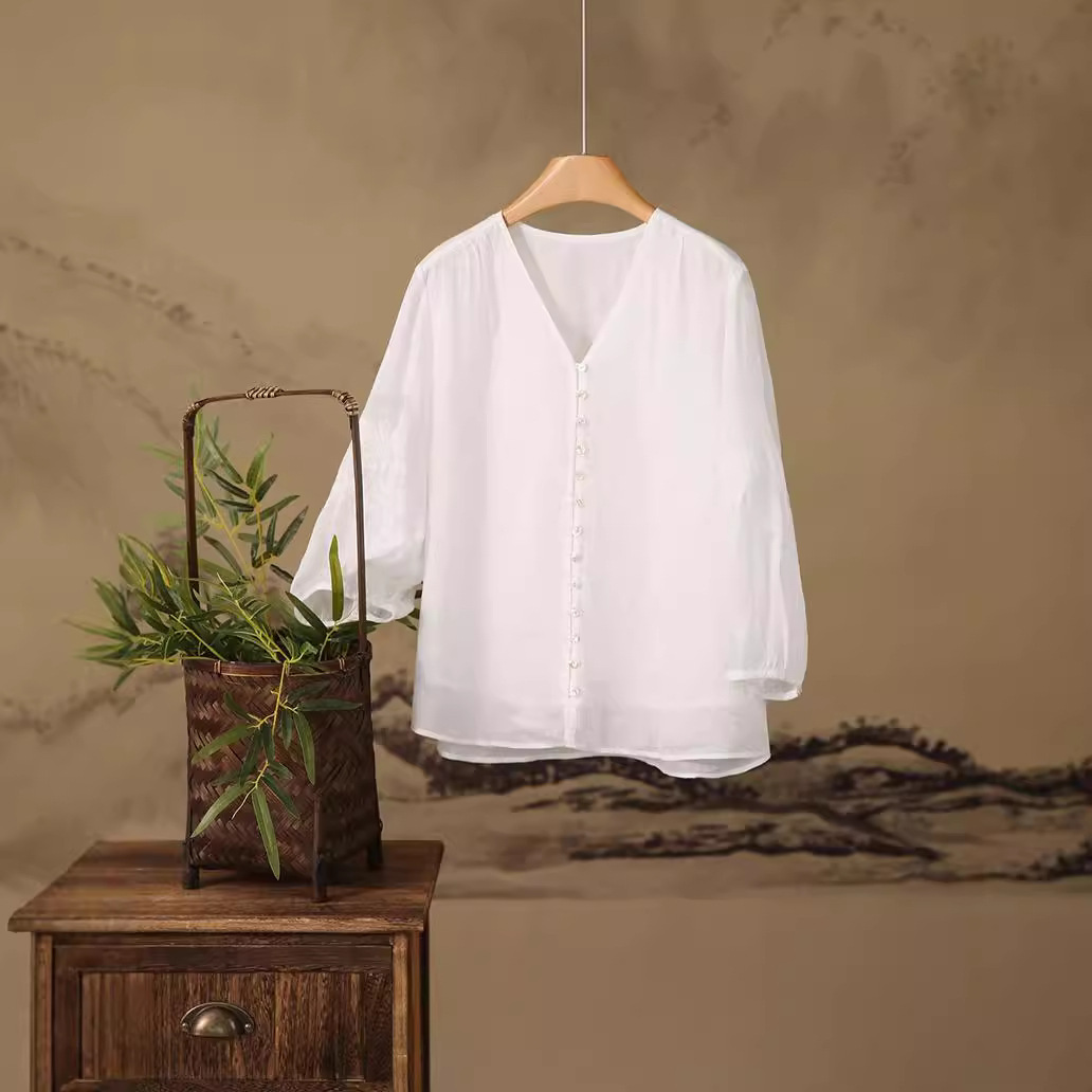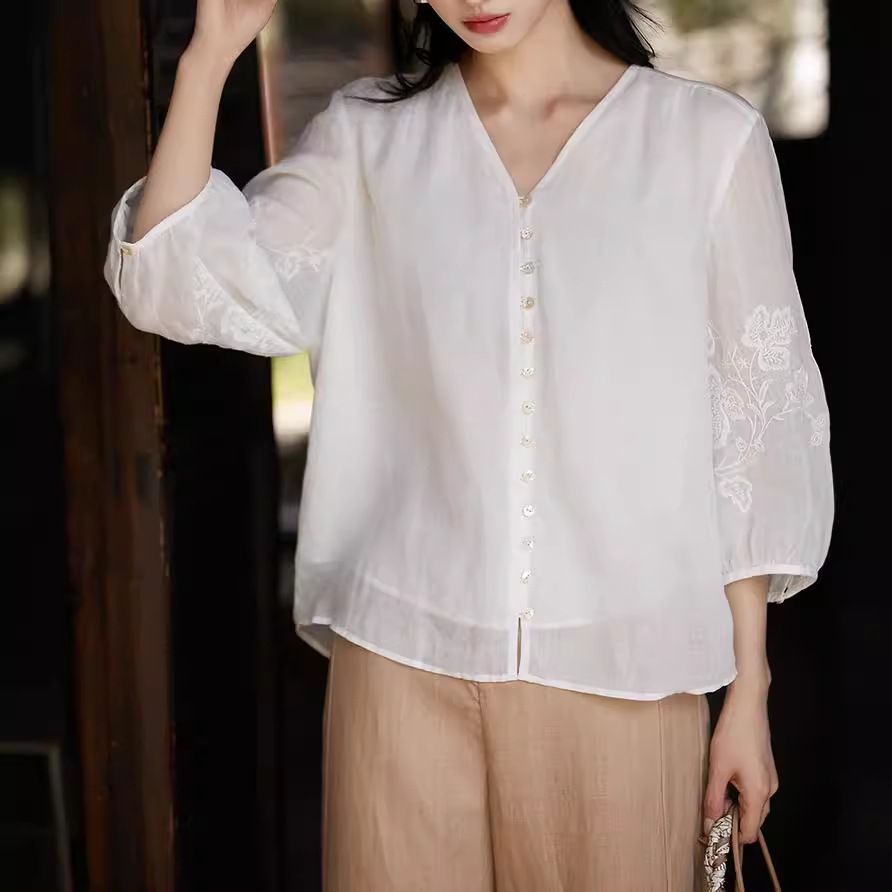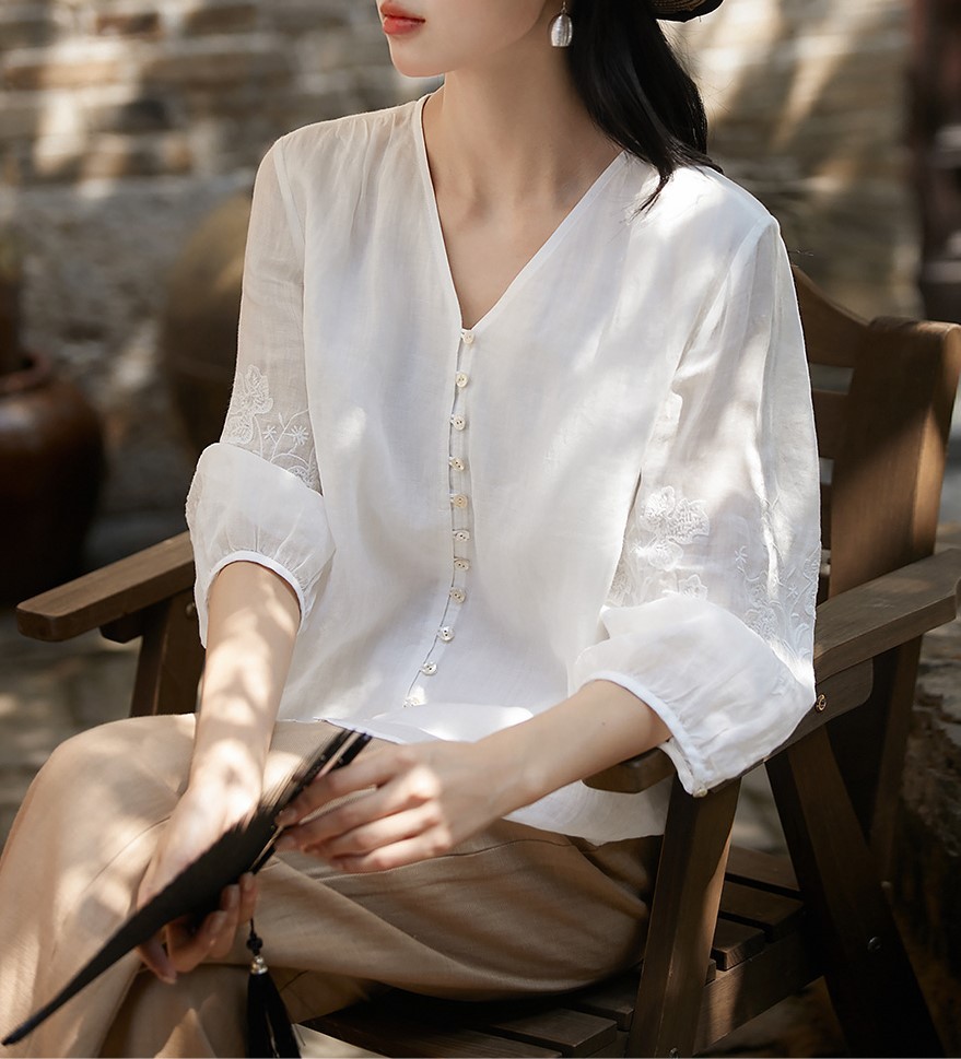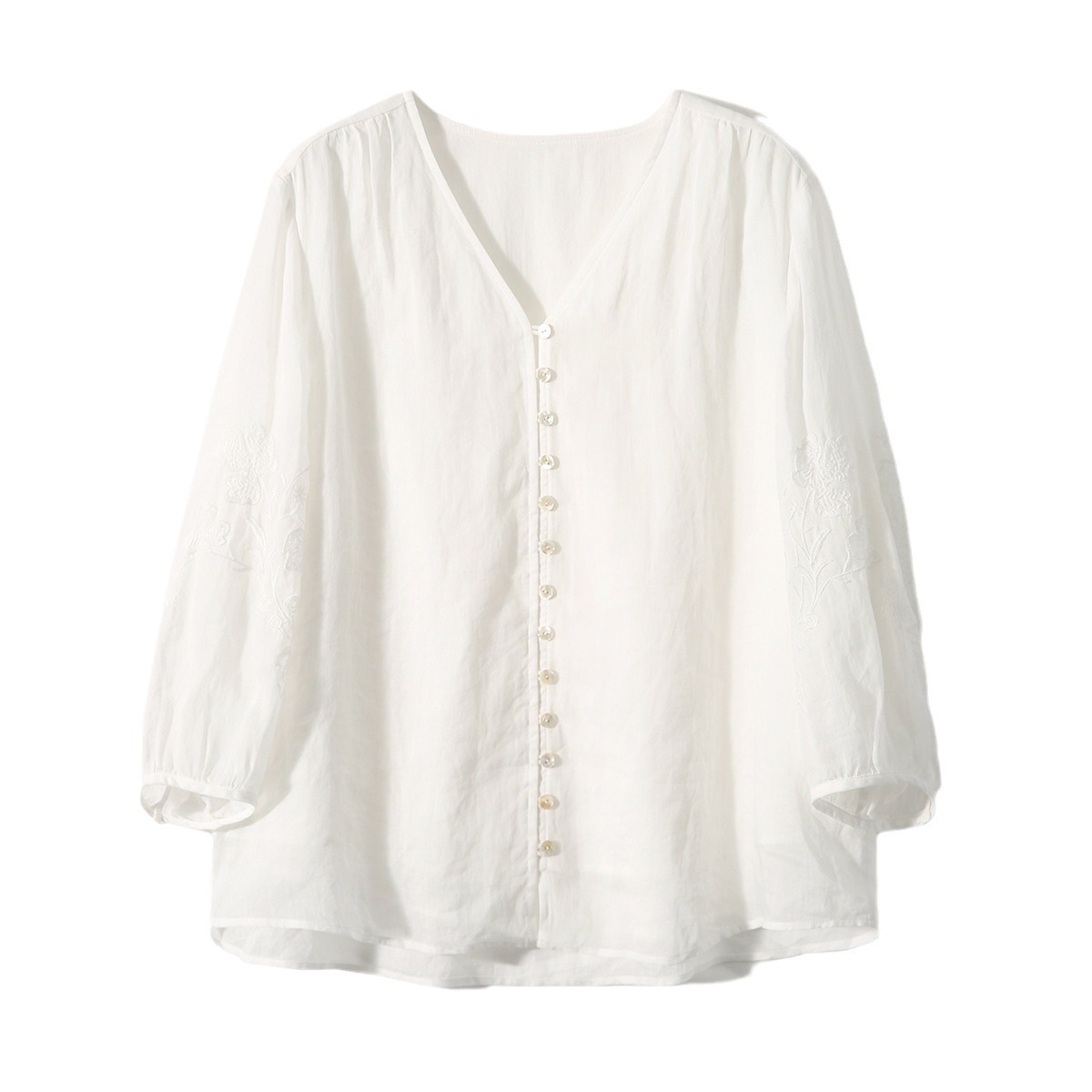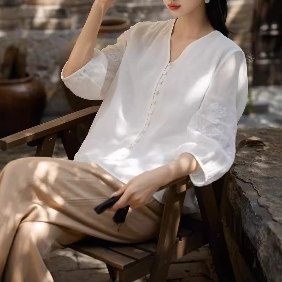 灵动飘逸呼吸感苎麻v领刺绣衬衫廓形衬衫女秋季新款百搭小上衣