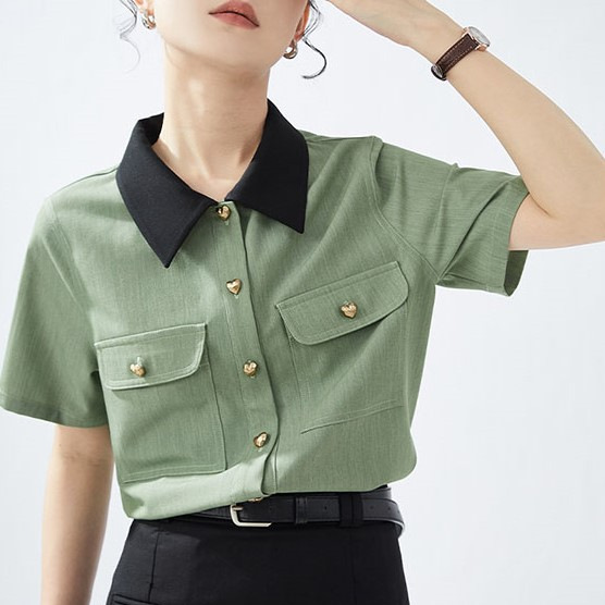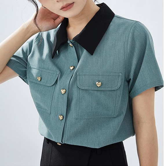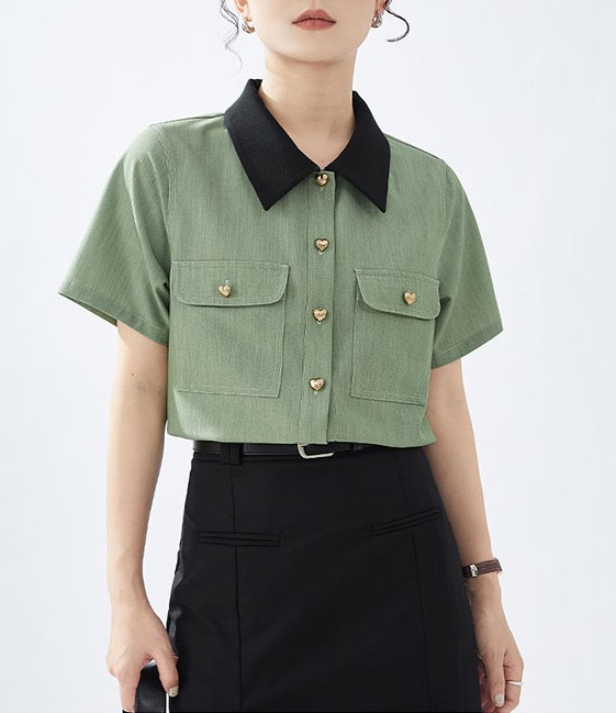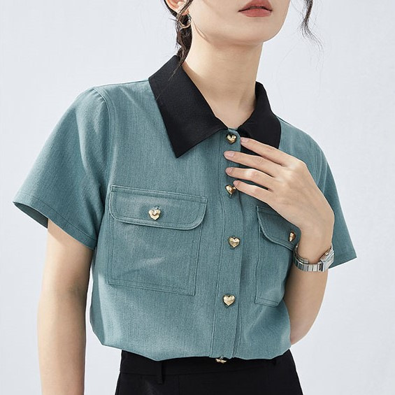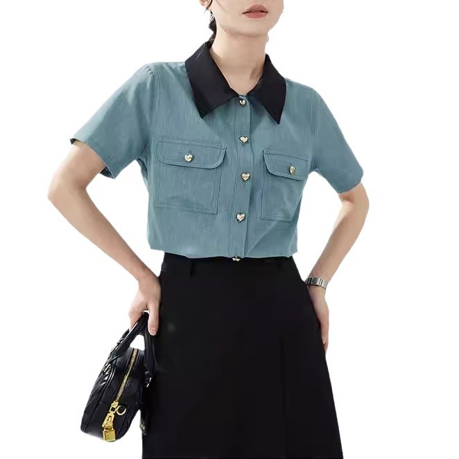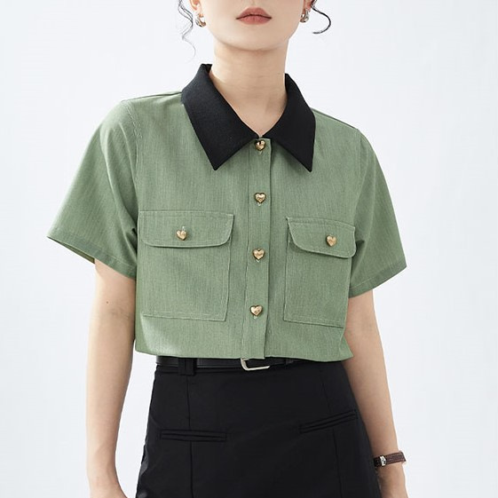 撞色翻领衬衫女夏新款复古爱心纽扣法式高级质感上衣