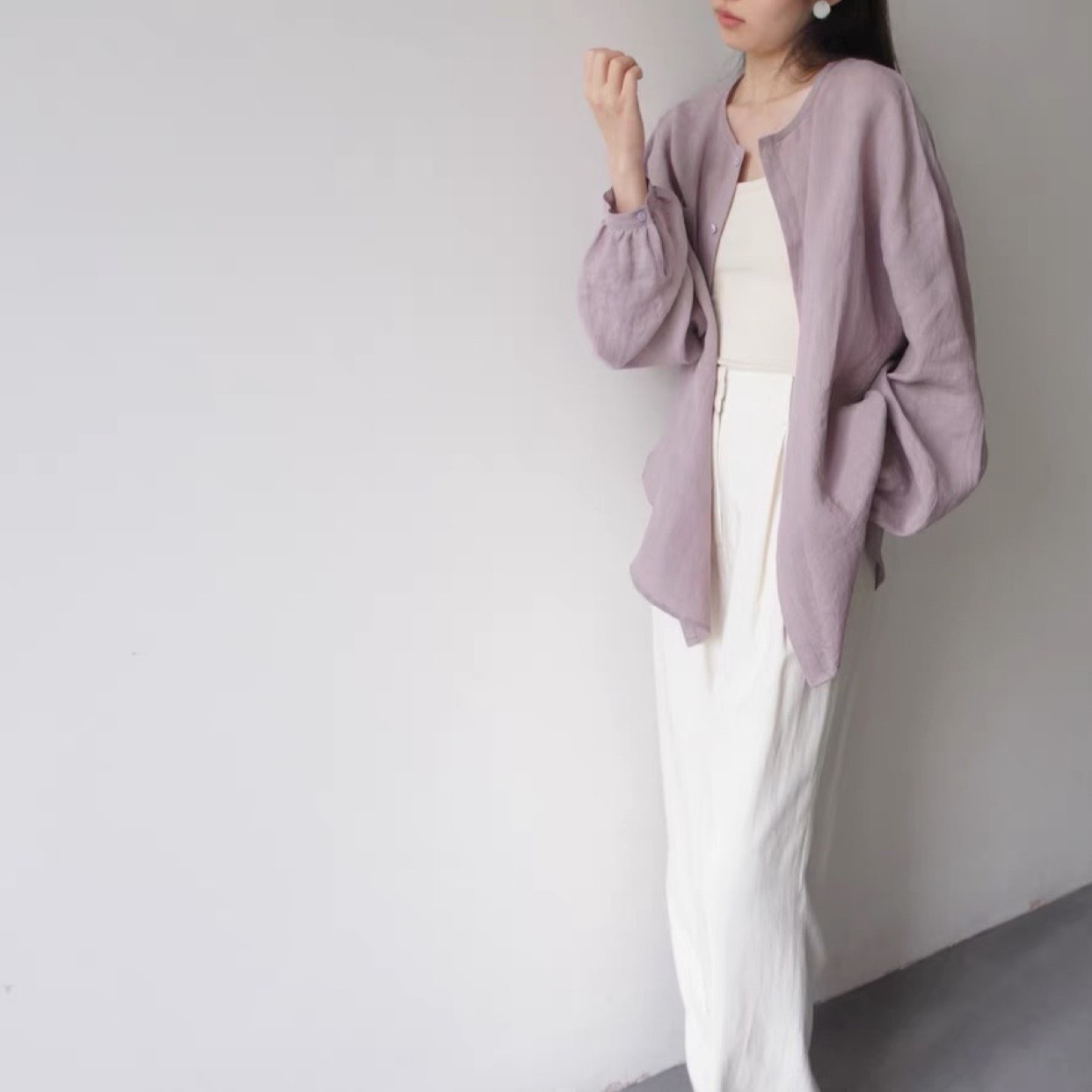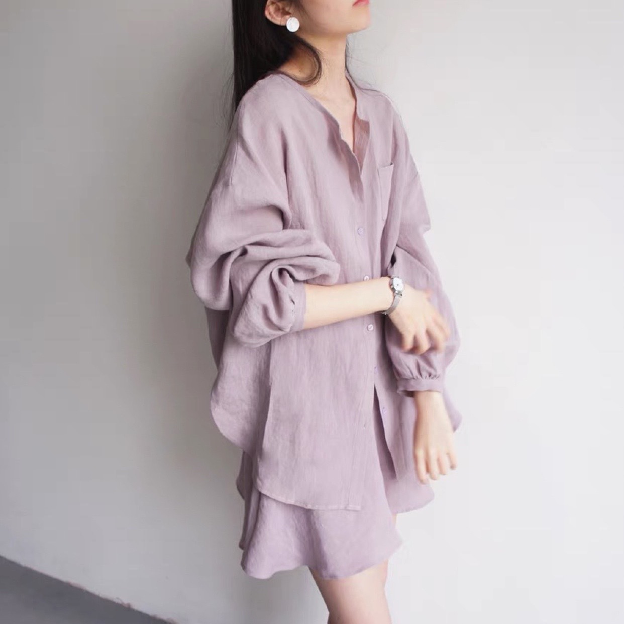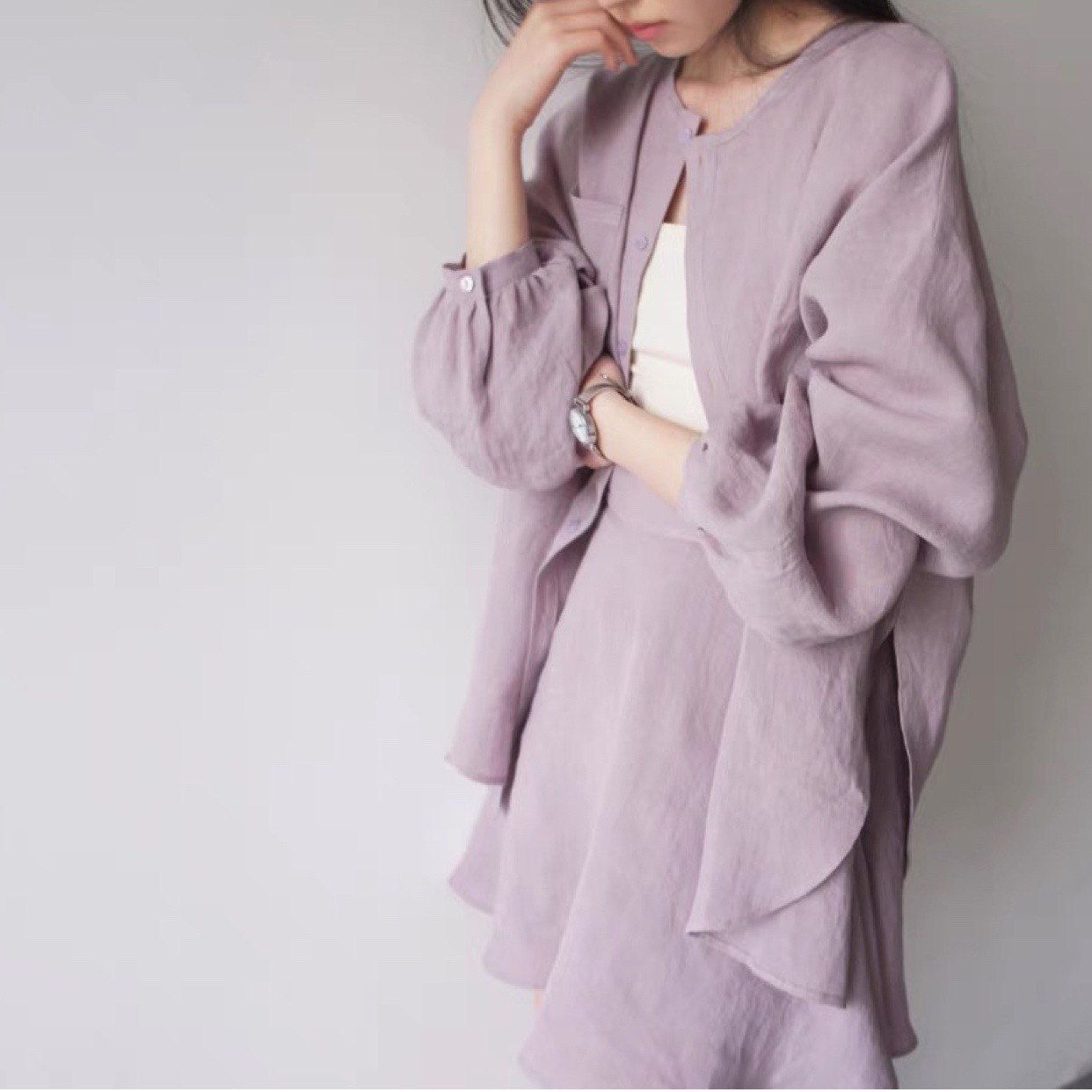 灰调紫亚麻长袖衬衫半身裙裤2件套松弛天然温柔高级气质女