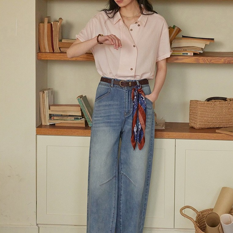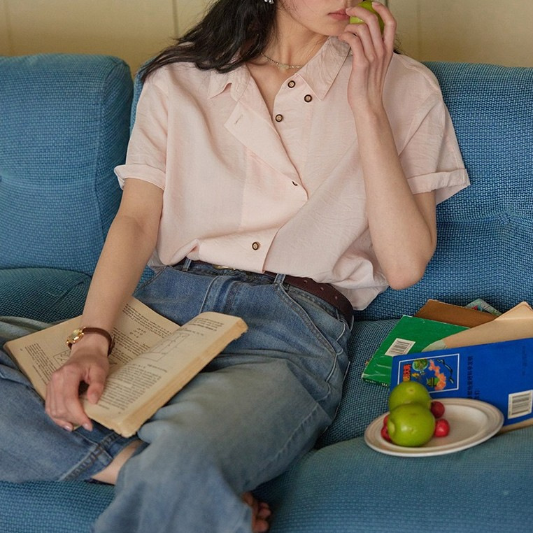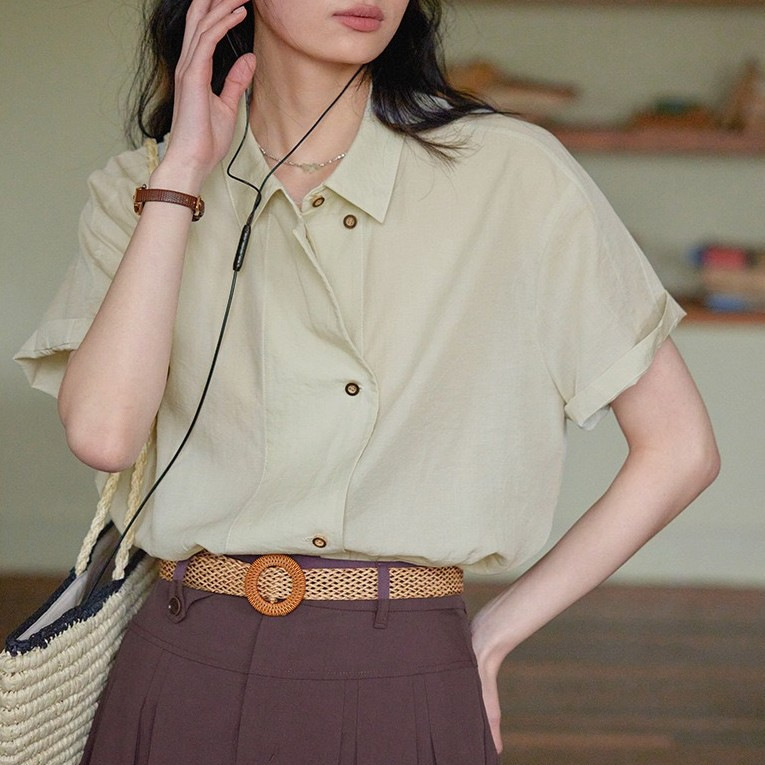 solhgter法式莱赛尔亚麻短袖衬衫女夏季25新款垂感宽松上衣