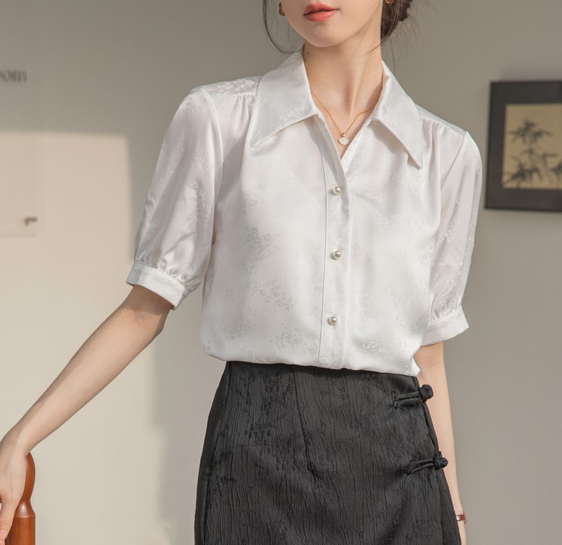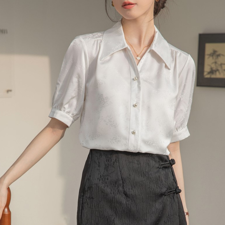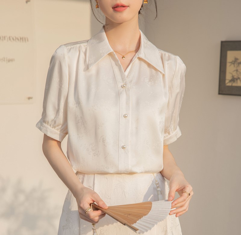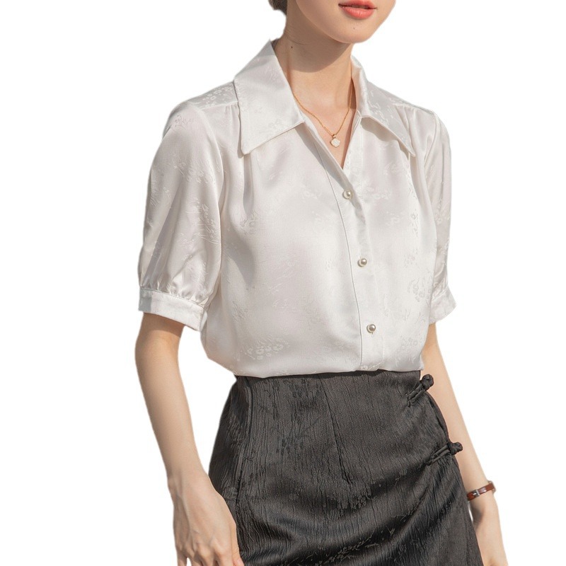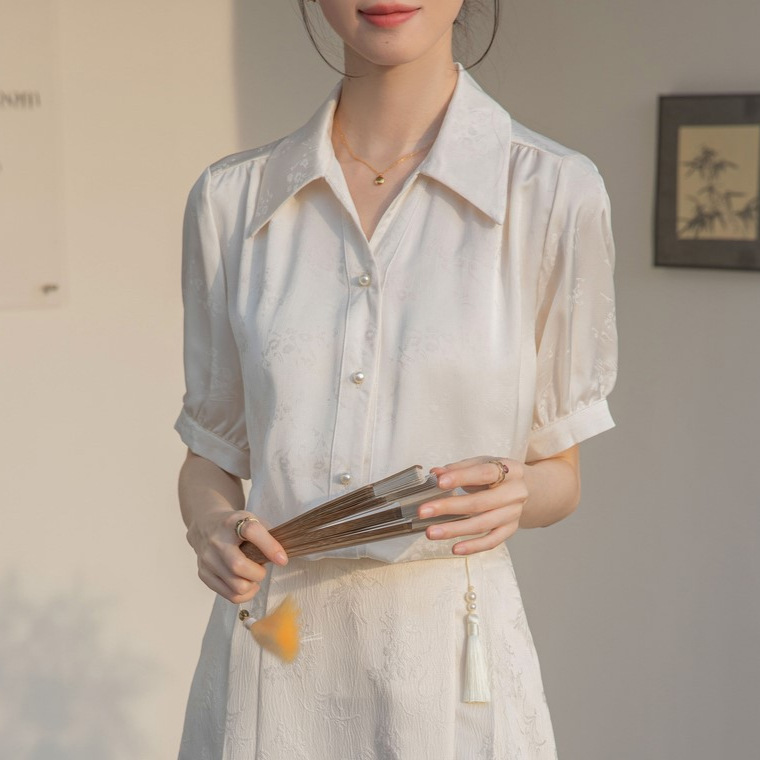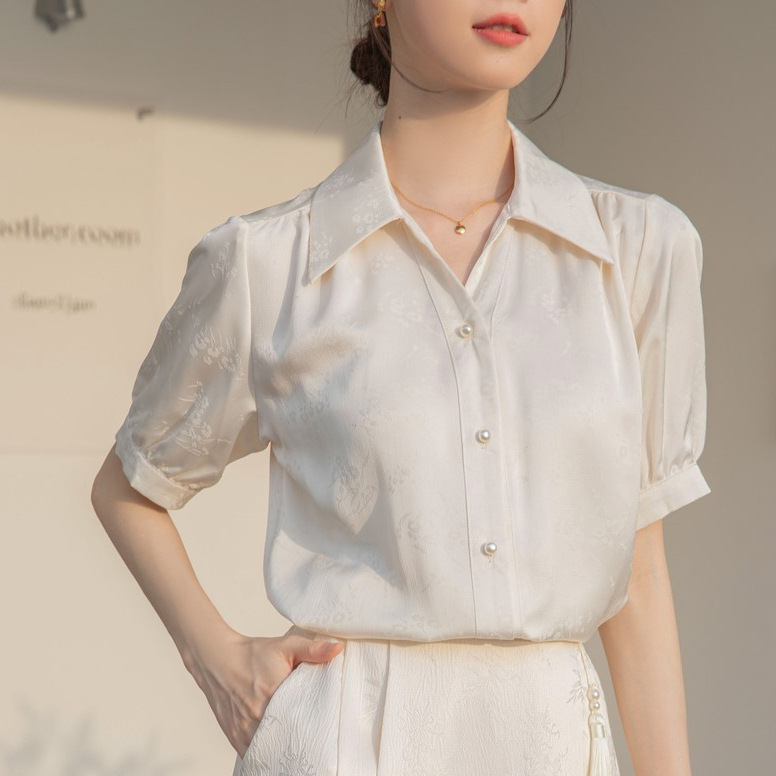 浅杏衬衫女醋酸缎面提花女夏季复古国风V领短袖衬衣通勤职业上衣