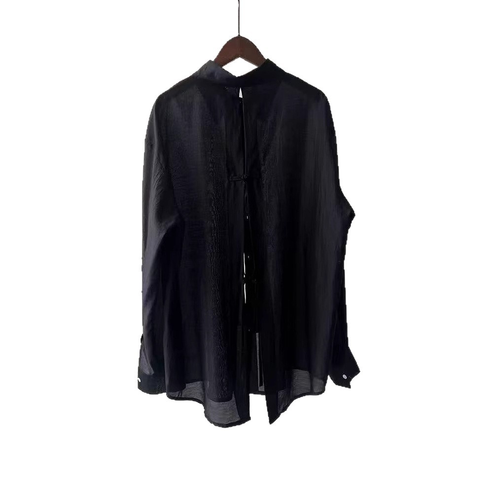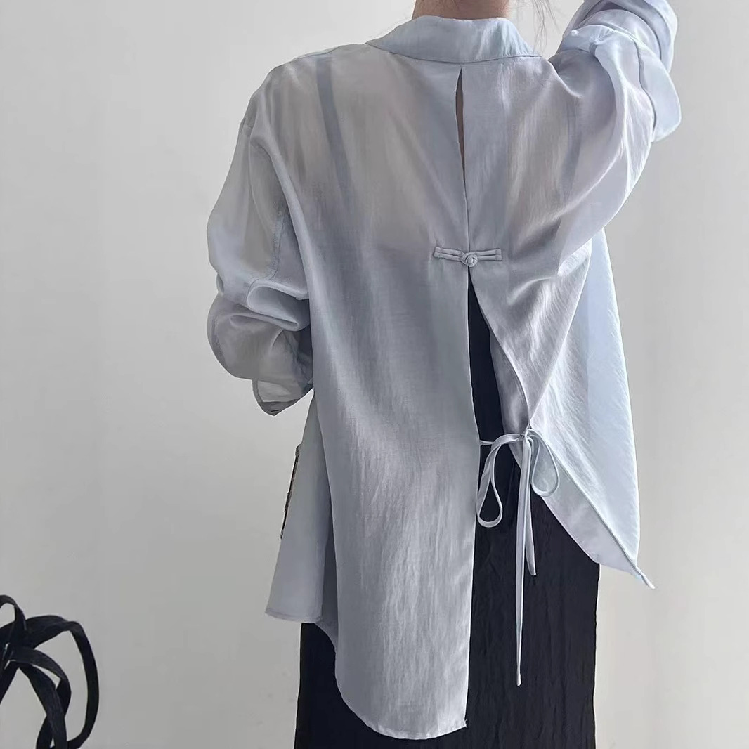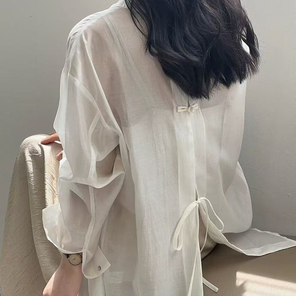 后背盘扣天丝衬衫女夏薄纱防晒珠光透视露背开叉上衣吊带外搭开衫