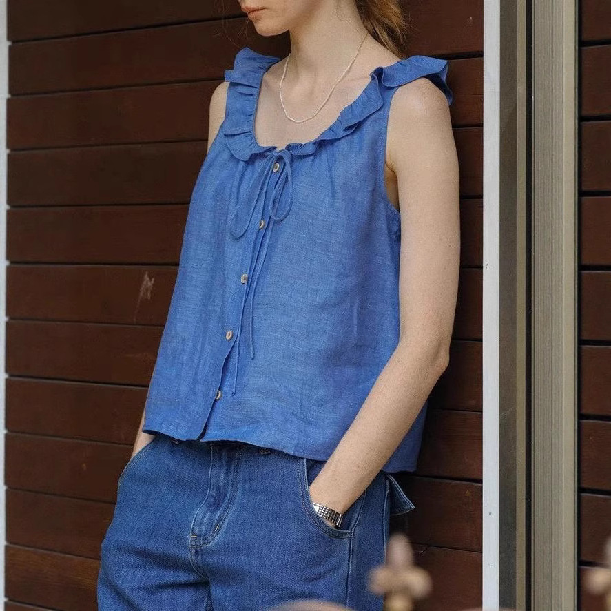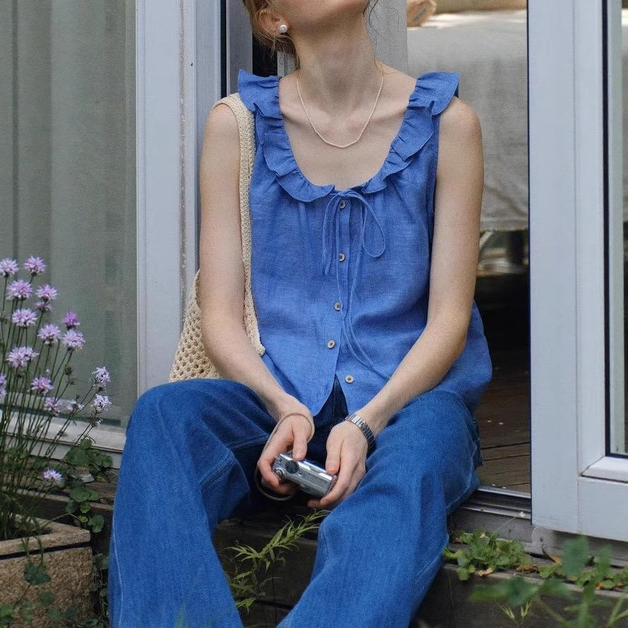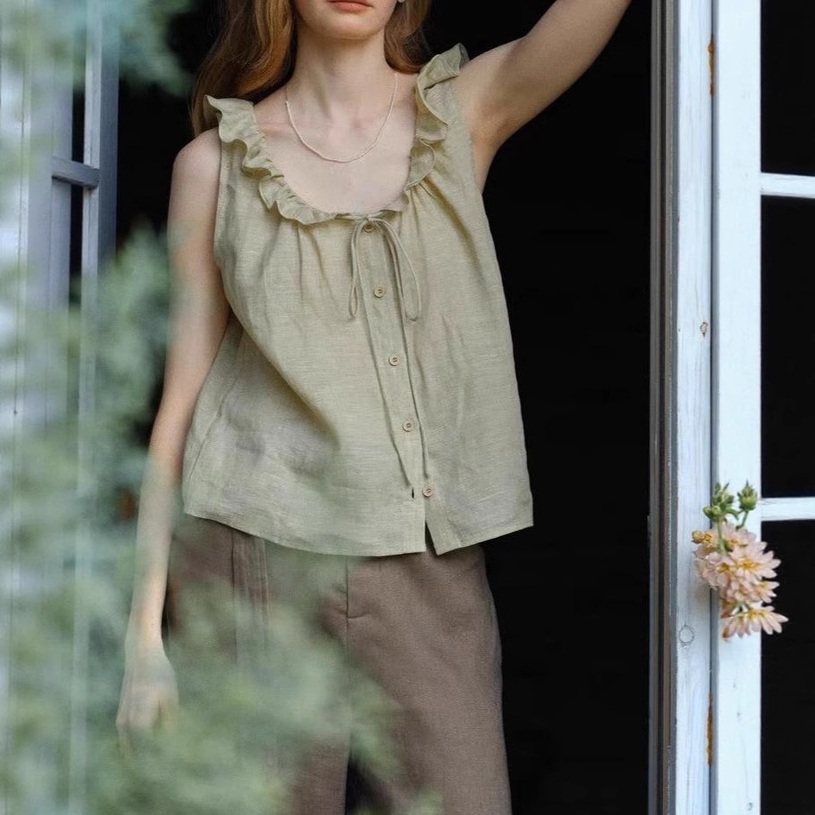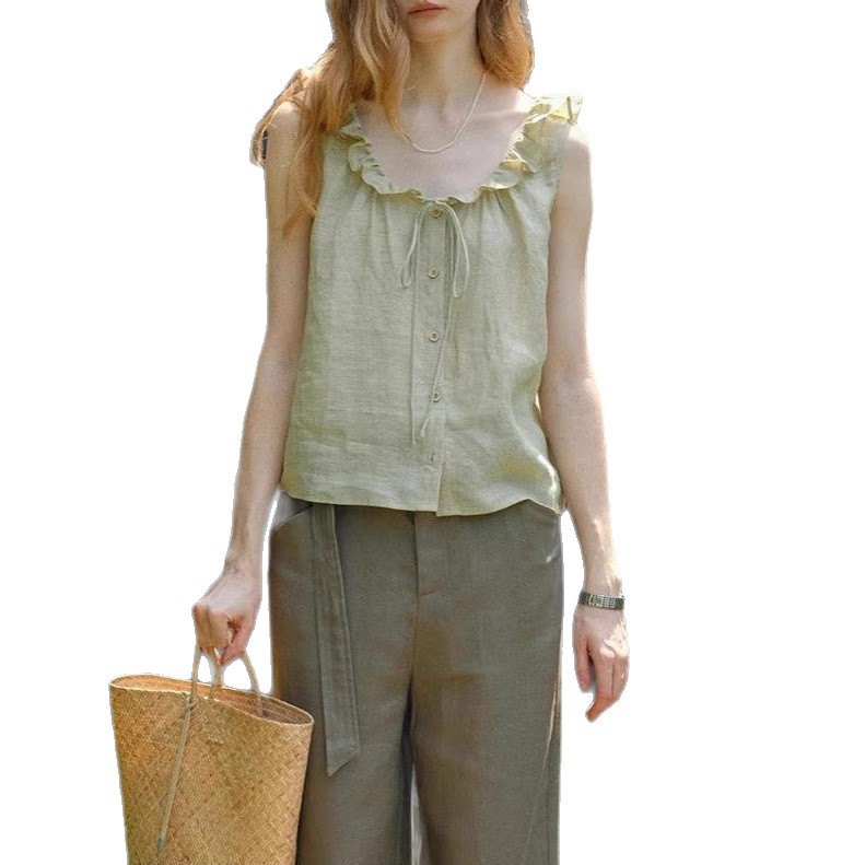 天然色织亚麻木耳荷叶花边领系带小衫无袖衬衫女夏薄款气质上衣