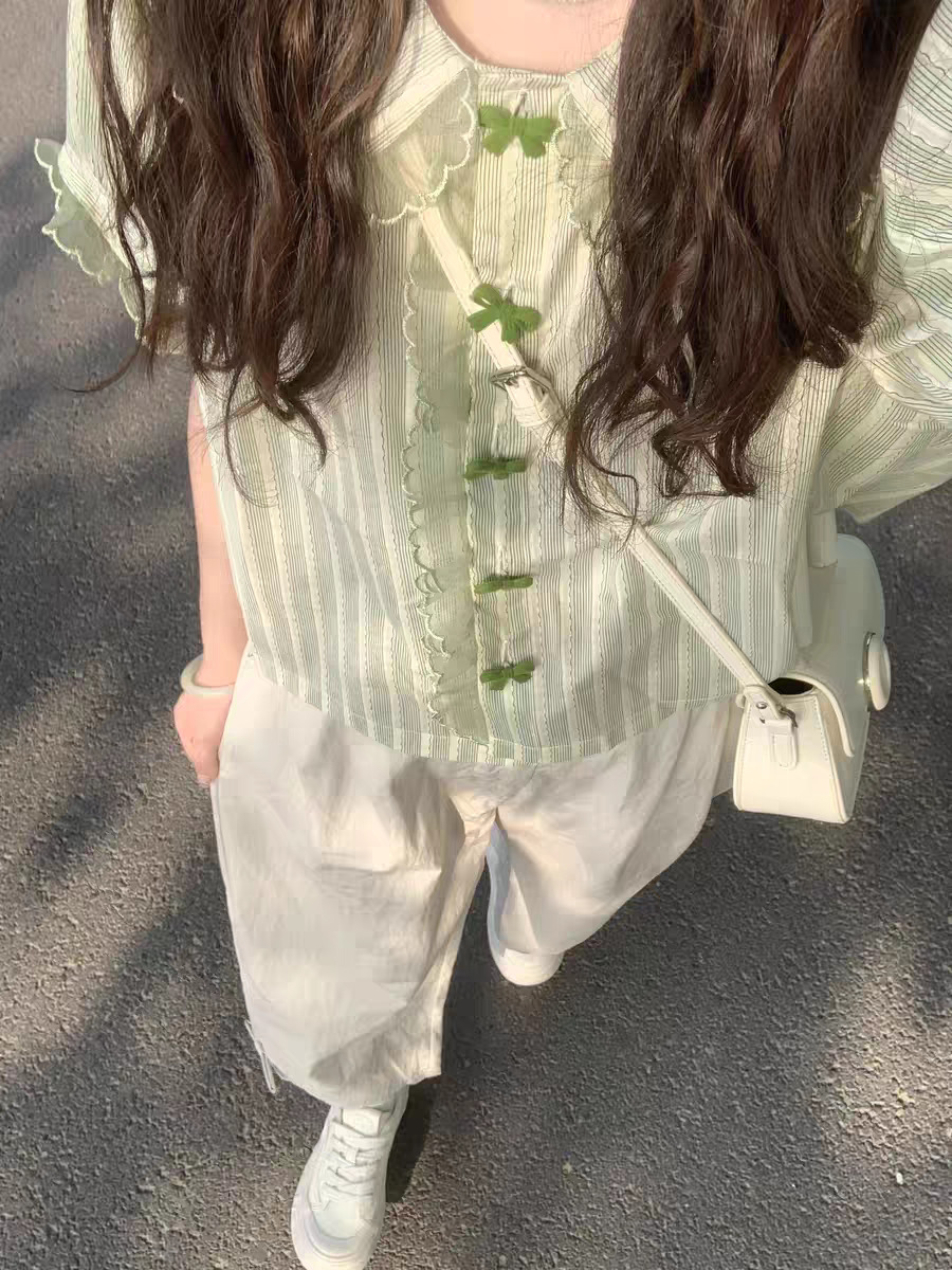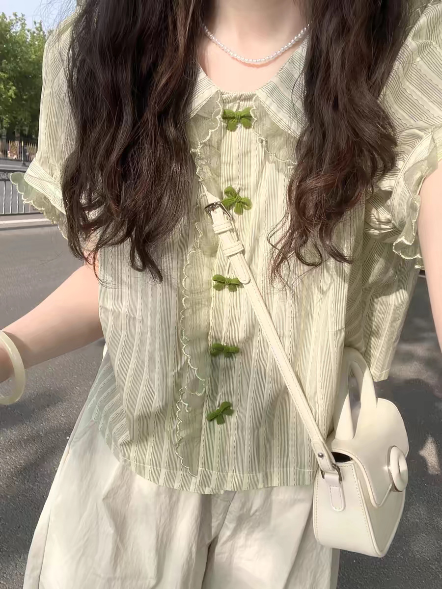 法式甜美短款娃娃领蝴蝶结衬衫女夏季小个子温柔风泡泡袖条纹上衣