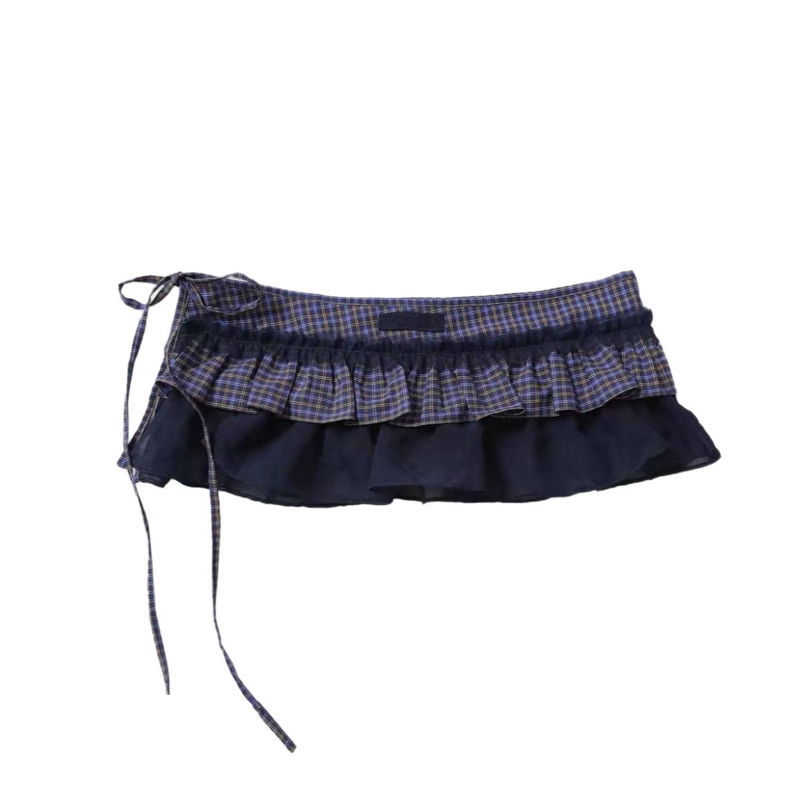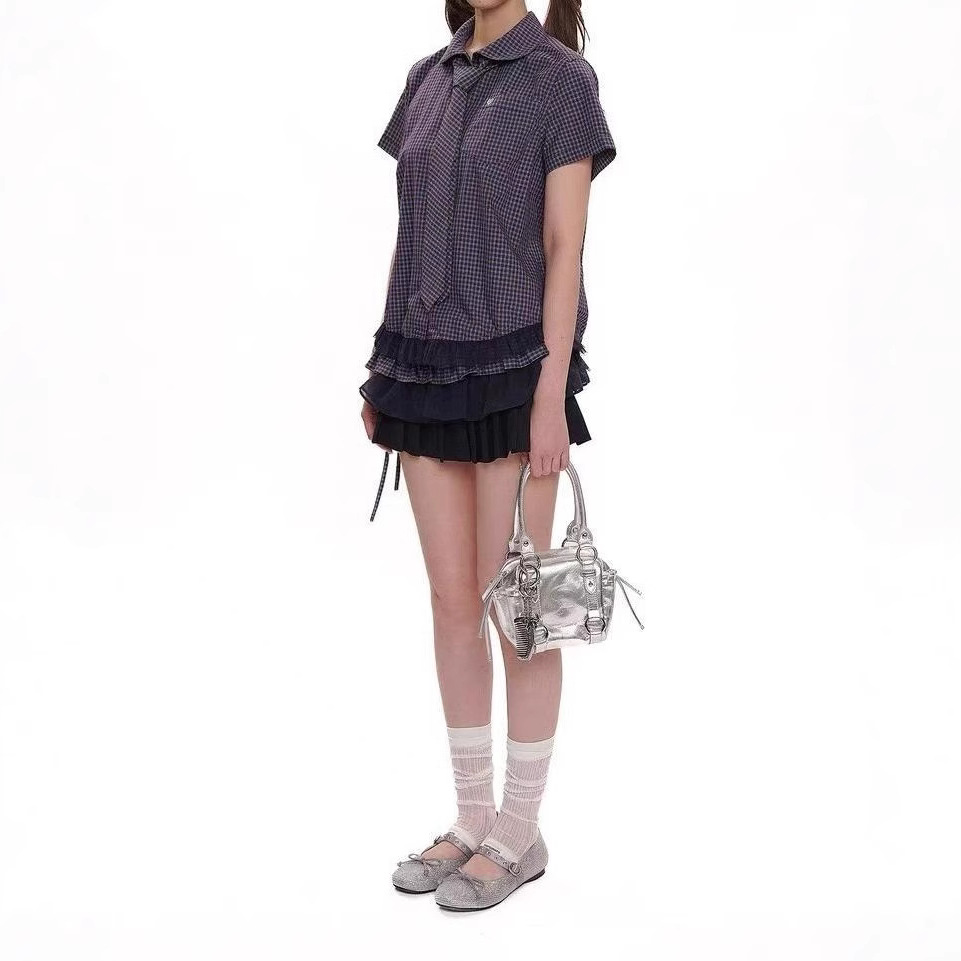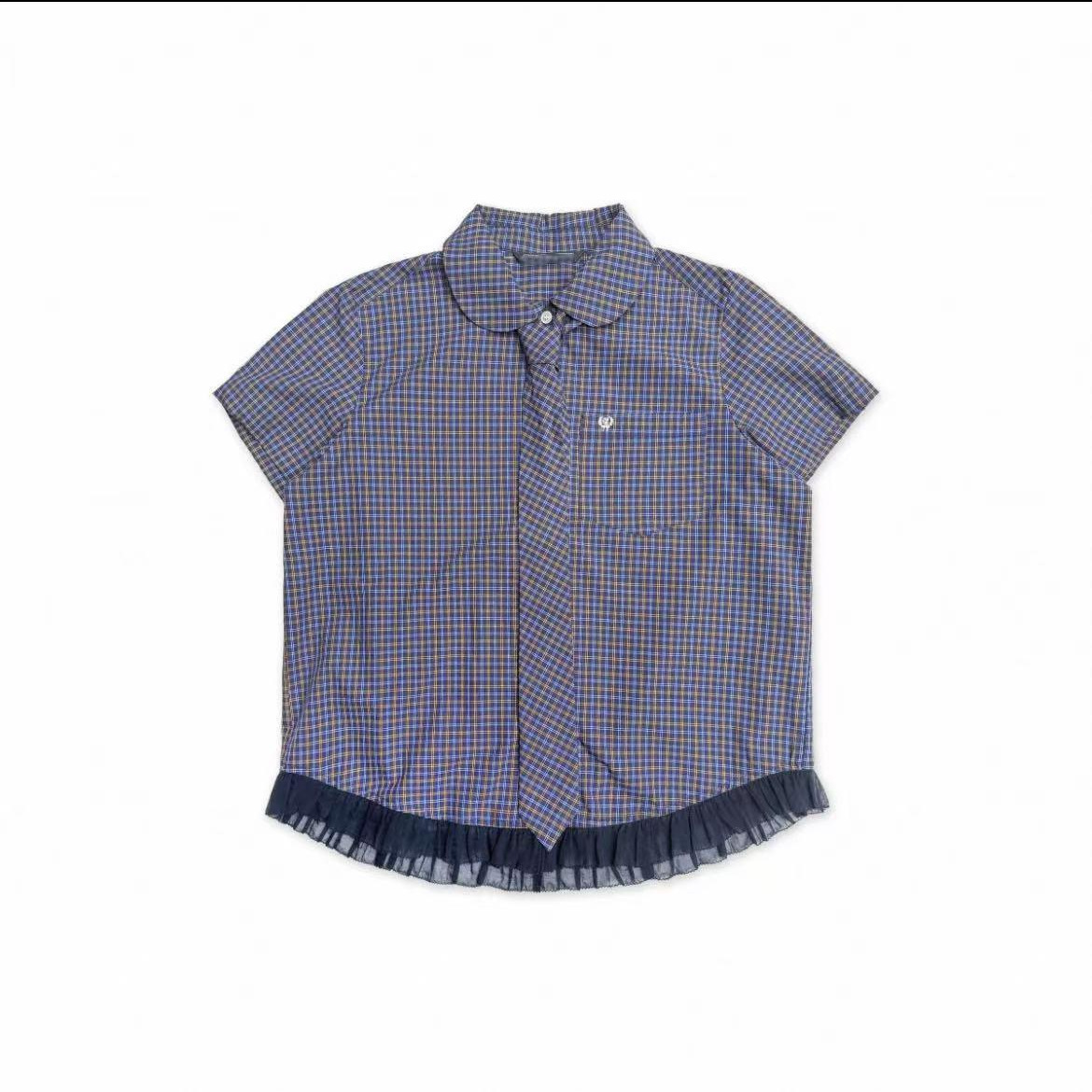 Moroomro复古格纹娃娃领下摆花边短袖衬衫/网纱格纹拼接双层屁帘